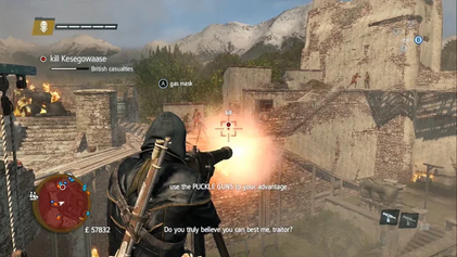 전투 시스템에는 ''블랙 플래그''의 블로우 파이프와 유사한 공기총이 도입되어, 원거리의 적을 소음 없이 제압할 수 있다. 공기총에는 수면 다트나 폭죽 등 다양한 종류의 탄약을 사용할 수 있다. 또한, 이야기 진행 중 특정 시점에서 셰이는 벤자민 프랭클린이 개조해준 수류탄 발사기를 소총에 부착하여 사용할 수 있게 된다.[10] 근접 전투는 개선되어, ''배트맨: 아캄'' 시리즈 게임처럼 타이밍에 맞춰 적의 공격을 반격하는 시스템이 적용되었다. 적 암살자들은 이전 시리즈에서 플레이어가 사용했던 기술들을 구사한다. 그들은 덤불 속에 숨거나 군중 속에 섞여들며, 플레이어를 향해 공중 암살을 시도하기도 한다.[9] 독가스가 환경적인 위험 요소로 등장하며, 셰이는 방독면을 사용하여 그 효과를 막을 수 있다. 적에게 추적당할 때는 이글 비전 기능이 변화하여, 이전 시리즈의 멀티플레이 모드처럼 레이더와 유사한 방식으로 적의 위치를 파악할 수 있게 된다. 이글 비전을 사용하지 않더라도 화면 가장자리가 붉게 변하며 추적자의 존재를 경고한다.