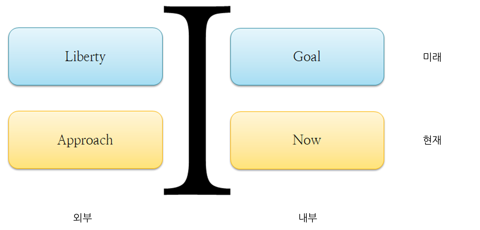 얼라인의 구조는 '나(I)'를 중심으로 하여 내부와 외부, 현재와 미래로 구성된다.[1] 내부는 자신이 통제할 수 있고 자신의 의지와 관련되어 있으며, 외부는 '나'와 관련은 있지만 목표를 위해 고려하고 상호작용해야 하는 외부 환경이다.[1] 미래는 궁극적 지향과 당면한 목적을 상징하며, 현재는 '나'를 포함한 현재의 환경에서 그 지향과 목표를 향해 실천하는 부분으로 구성되어 있다.[1]
