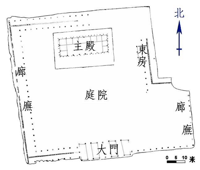 1960년에 광대한 궁전 자취나 청동기 공방 등의 자취가 발견되어 중국에서 가장 오래된 궁전 건축의 기초인 것이 확인되었다. 1호 궁전터의 토대는 방형으로, 남북 약 100m, 동서 약 108m이다. 2호 궁전터는 1호 궁전터의 동북쪽으로 약 150m 떨어진 곳에 위치하며 동서로 42.5m, 남북으로 12.5m의 토단이 출토되었다.