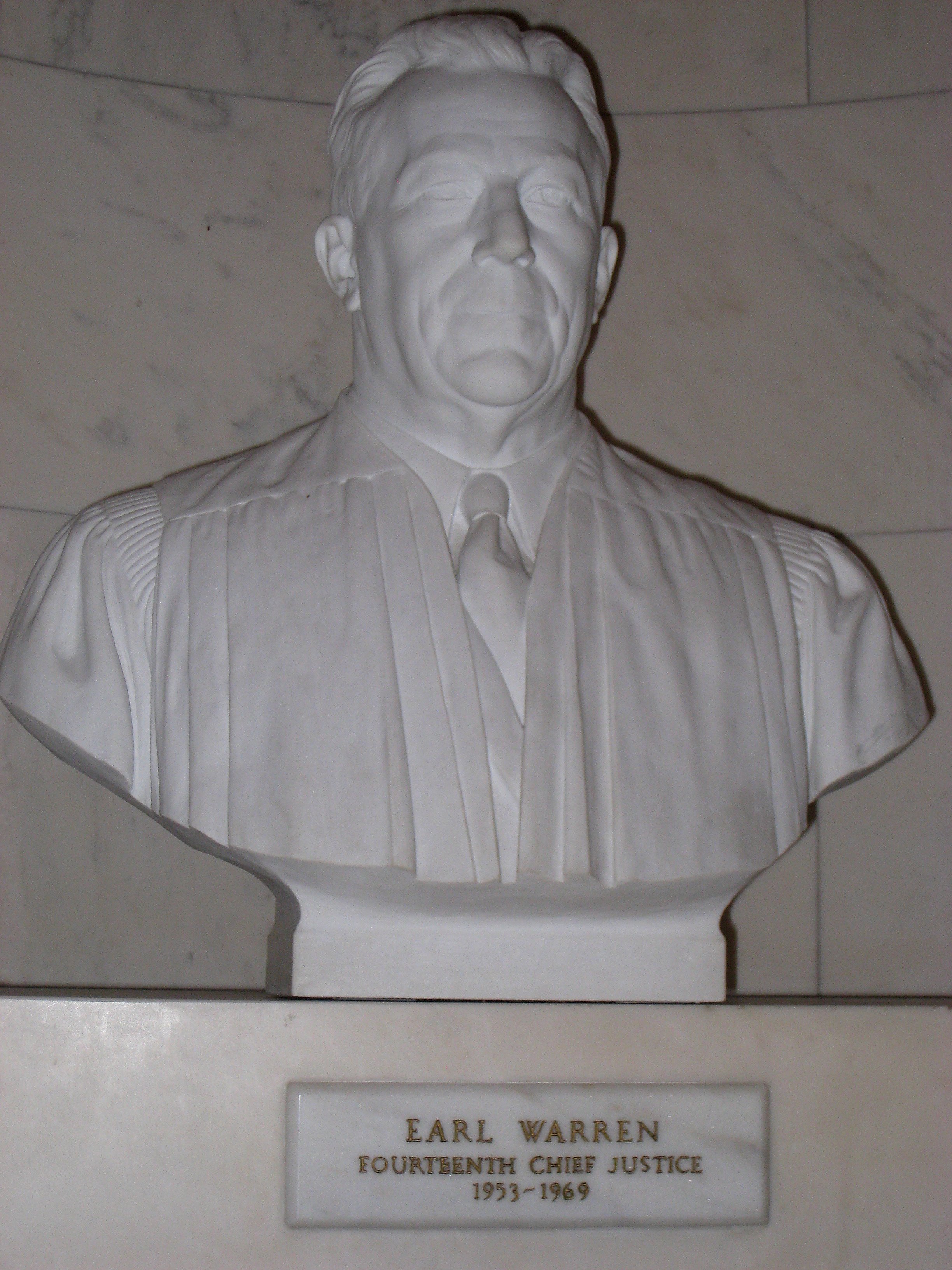 얼 워런은 1891년 캘리포니아주 로스앤젤레스에서 태어나 캘리포니아 대학교 버클리와 로스쿨을 졸업했다. 그는 제1차 세계 대전에 참전했으며, 1925년 앨러미다 군 지방 검사로 임명되어 정부 부패 척결에 힘썼다. 1939년 캘리포니아주 법무장관, 1943년에는 일본계 미국인 강제 수용을 지지했으나 후에 후회했다. 1942년 캘리포니아 주지사로 선출되어 3선 연임했으며, 1948년에는 부통령 후보로 출마했으나 낙선했다. 1953년 미국 연방 대법원장으로 임명되어 브라운 대 교육위원회 판결, 미란다 원칙 확립 등 자유주의적 판결을 이끌었다. 1963년 케네디 암살 사건을 조사하는 워런 위원회의 위원장을 맡았으며, 1969년 대법원에서 퇴임한 후 1974년 심근 경색으로 사망했다. 그는 대통령 자유 훈장을 받았으며, 여러 기념 시설과 기관에 그의 이름이 사용되었다.