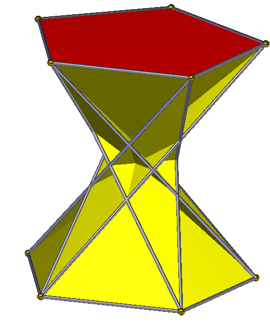 교차 오각 기둥은 균일하게 만들 수 없지만, 위상적으로는 ''오각 기둥''과 동일하다. 옆면은 이등변삼각형이다. 이는 d5d 대칭, 차수 10을 갖는다. 꼭짓점 배치는 3.3/2.3.5이며, 하나의 삼각형은 역행하고 꼭짓점 배열은 오각 기둥과 동일하다.