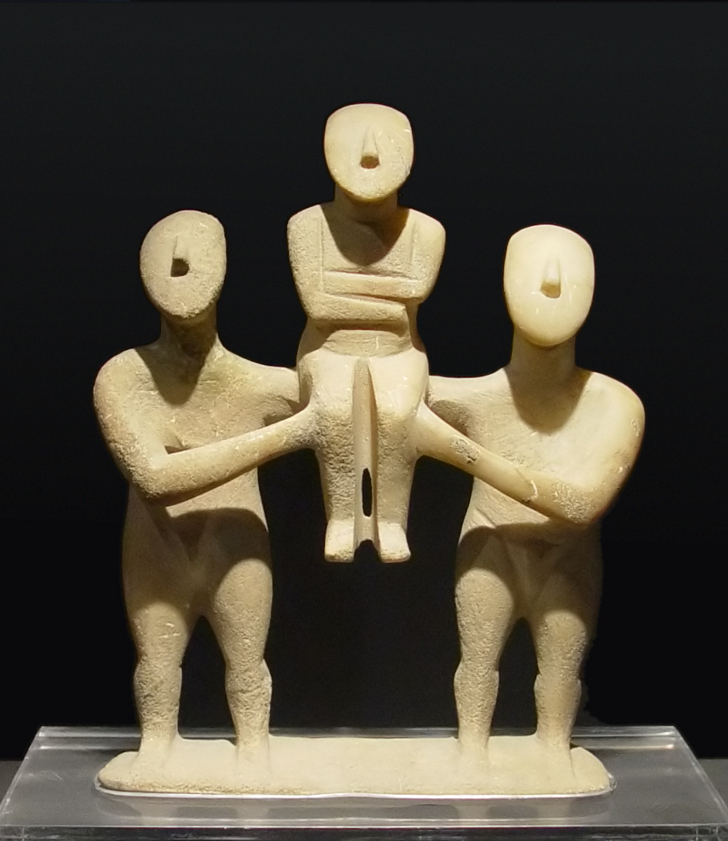 키클라데스 미술의 가장 유명한 예시는 독특한 형태의 대리석 조각상으로, 얼굴에는 코만 묘사되어 있고 가슴에 팔짱을 낀 자세의 누드 여인상이다. 원래는 이 석상 위에 그림을 덧그렸으나 지금은 지워졌다. 이 조각상들은 약 1400점 정도가 알려져 있으며, 대부분 미술 시장을 충족시키기 위해 알려지지 않은 무덤에서 가져온 것이다.[3]이 여성 조각상들은 어머니와 풍요의 여신을 나타내는 것으로 여겨진다.[1][4] 키클라데스 누드 조각상은 매우 양식화되어 있으며 이 지역의 독특한 특징을 보여준다. 매우 평평하고 쐐기 모양의 몸체, 기둥 모양의 목, 잘 정의된 코를 제외하고는 특징 없는 타원형 얼굴이 특징이다. 조각상은 매우 미묘한 곡선과 무릎과 복부에 미묘한 표시를 가지고 있다.[4]