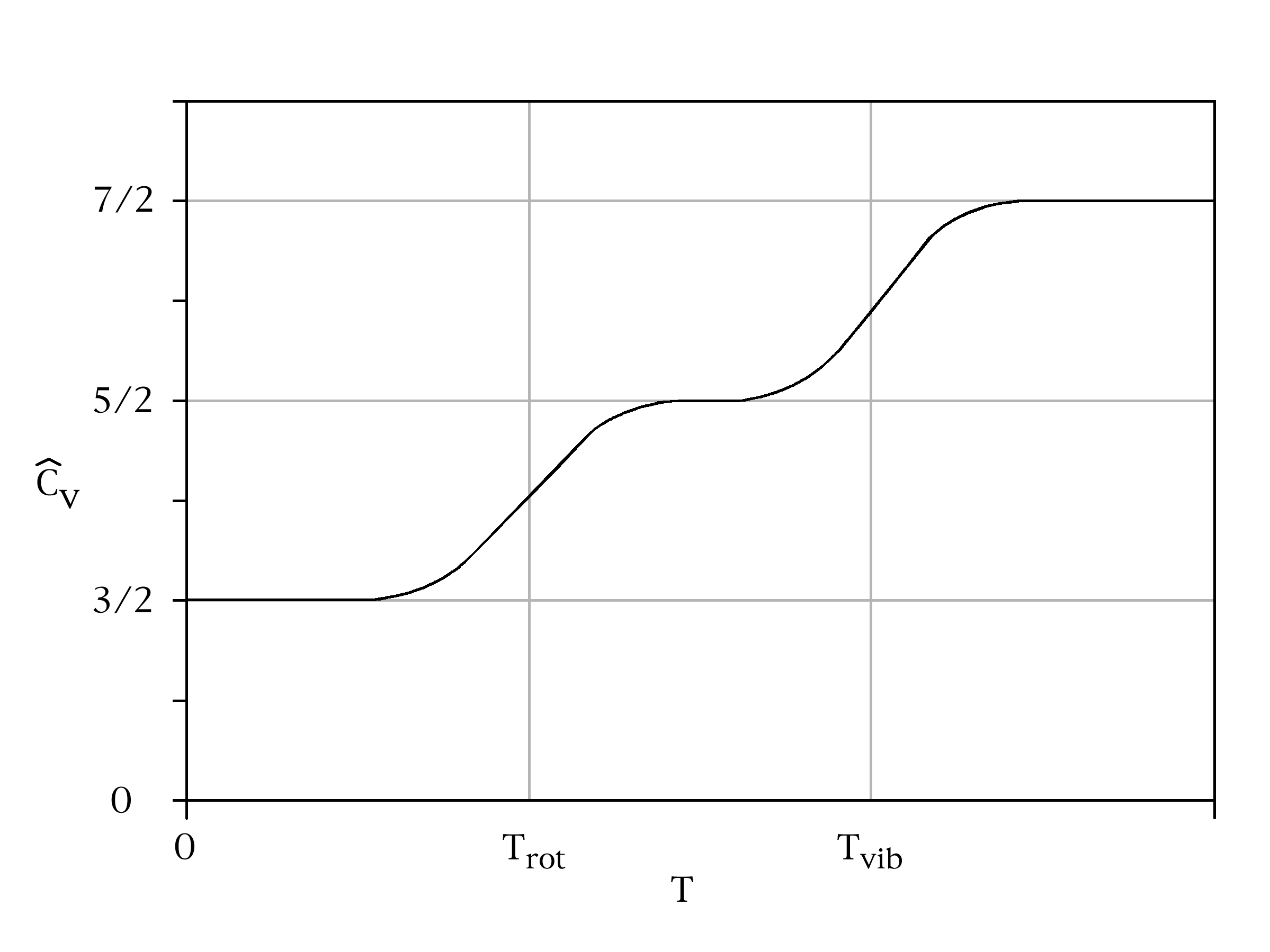 가 된다. 위 식의 첫 번째 괄호 부분은 단원자 분자의 경우와 같은 자유도에 의한 에너지이며, 두 번째 괄호가 이원자 분자의 회전에 관한 자유도(''θ''와 ''φ''의 2개 존재)로부터의 에너지이다. ''θ''와 ''φ''는 이원자 분자를 하나의 축(강체의 막대)으로 간주했을 때의 회전에 관한 각도 성분(자유도)이다. ''m''은 이원자 분자의 질량, ''I''는 이원자 분자의 질량 중심을 지나고, 이원자 분자의 축에 수직인 축 주위의 회전에 관한 관성 모멘트이다.