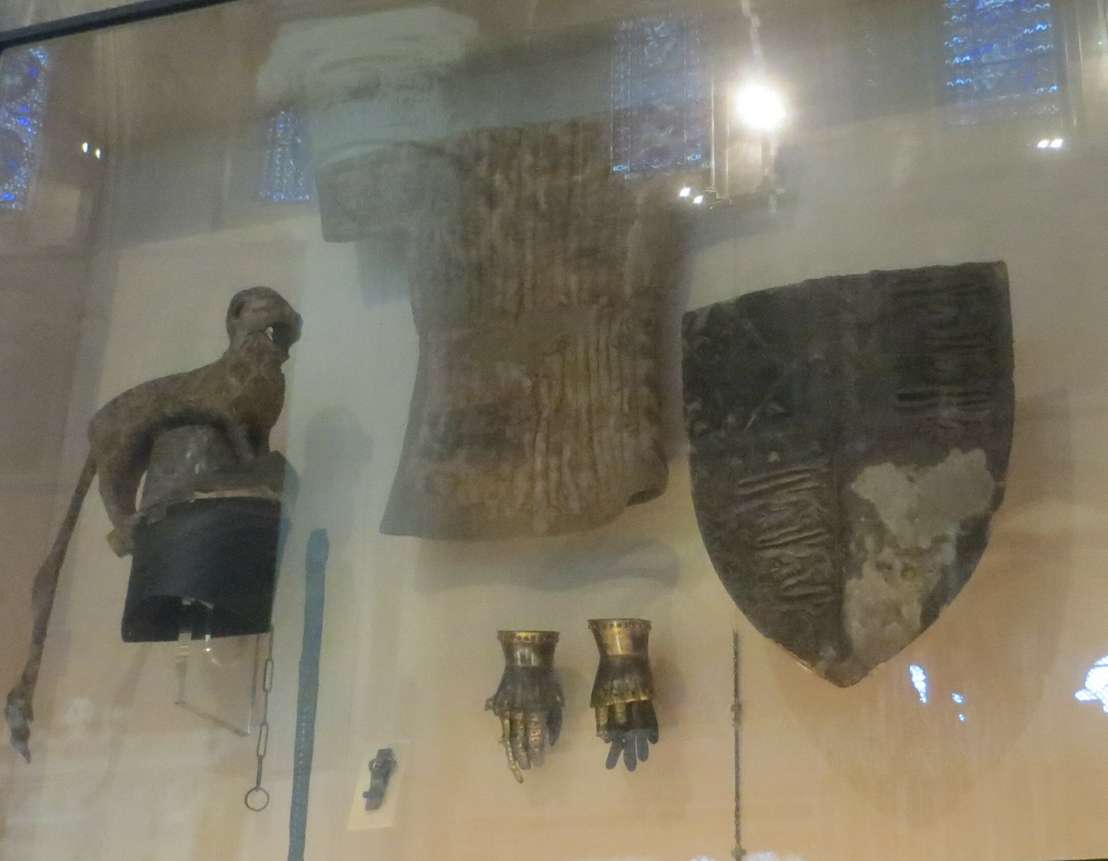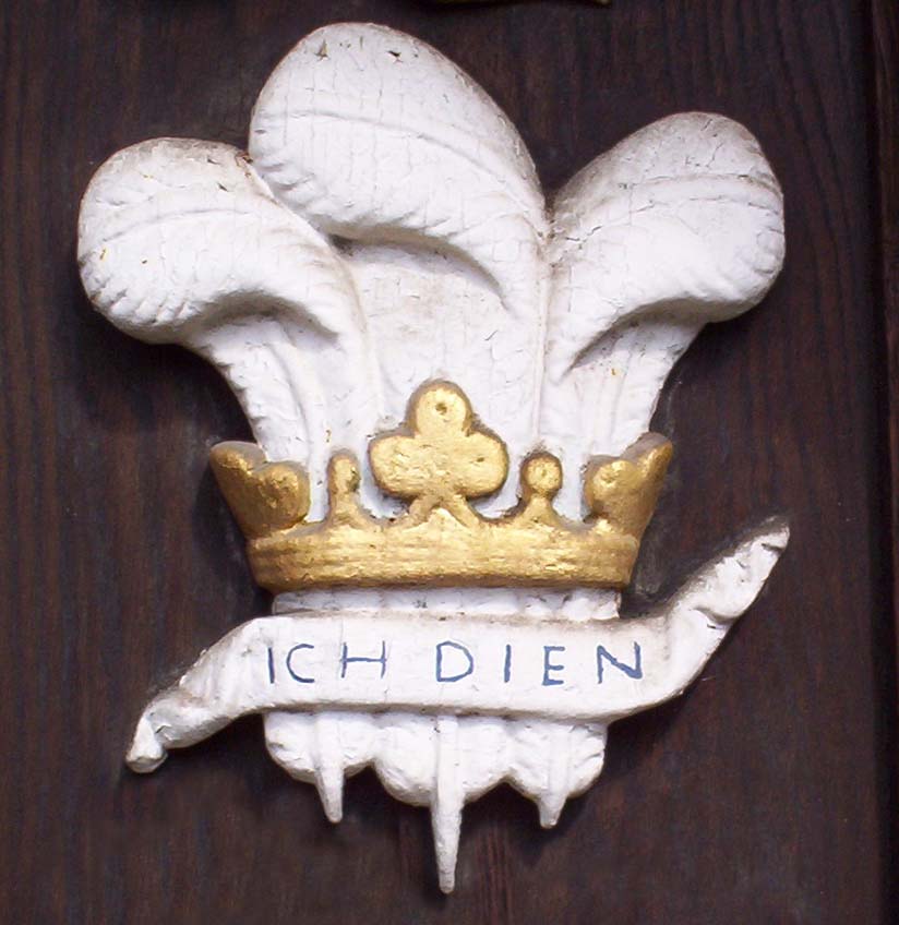 흑태자가 크레시 전투에서 죽인 보헤미아 국왕 얀에게서 '''타조 깃털 세 개''' 문장과 "''Ich dien''"(나는 섬긴다)이라는 모토를 얻었다는 이야기가 전해진다. 실제로 타조 깃털은 흑태자 사후 그의 고유한 휘장으로 인식되었다. 비록 보헤미아 국왕 얀의 공식 문장은 독수리 날개였지만, 타조는 그의 가문(예: 보헤미아의 안나 여왕, 보헤미아의 벤체슬라스 4세)에서 사용된 휘장이었을 가능성이 있다.[14][15] 흑태자는 유언에서 이 깃털을 '평화를 위해'(즉, 무술대회를 위해) 사용한다고 명시하며 문장이 아닌 휘장으로 지칭했다. 이 깃털 휘장은 왕실의 다른 구성원들이나 노퍽 공작 토마스 드 모브레이 같은 귀족들도 사용했다.[17] "''Ich dien''" 모토는 흑태자가 사용한 또 다른 모토인 "''Houmout''"(고양된 정신)와 함께 그의 인장에 사용되었으며, 둘 다 플랑드르어나 저지 독일어에서 유래했을 것으로 추정된다.[20][21] 초기 기록에는 이 모토가 보헤미아 국왕과 직접적인 관련이 있다는 언급은 없다. 역사가 캠든은 이를 고대 영어 "''Ic þien''"으로 해석하며 흑태자의 왕위 계승자로서의 지위와 연결시키기도 했다.[18][19]