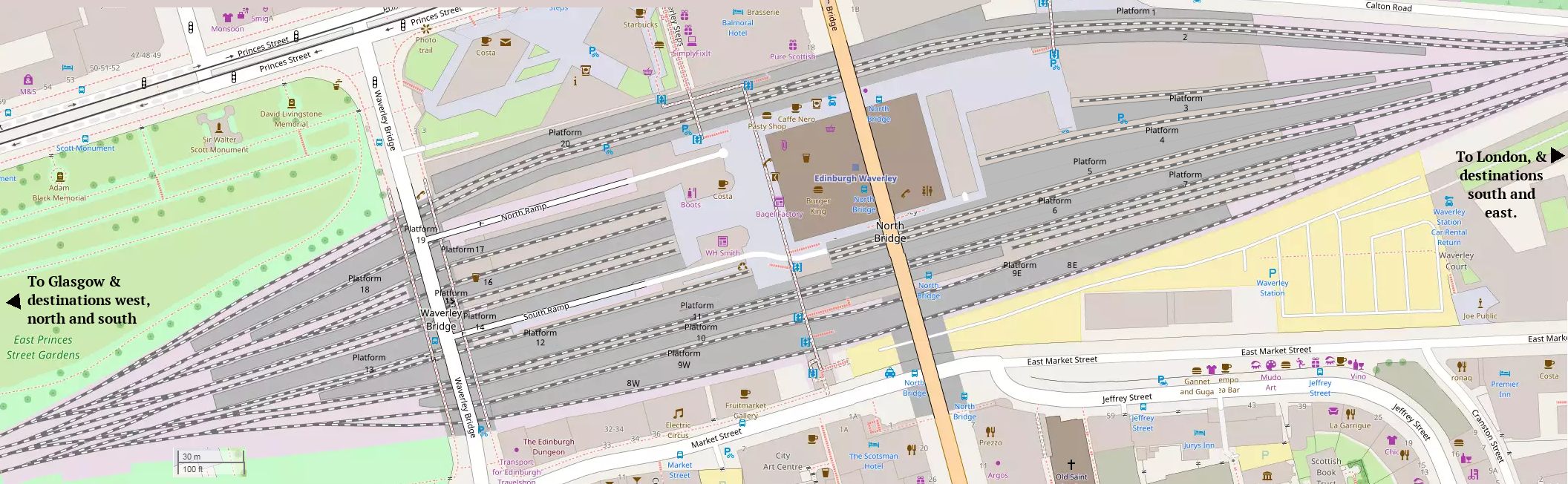 중앙 매표소는 다리의 북쪽 거대한 석조 교각 바로 서쪽에 위치해 있으며, 교묘하게 그 속에 숨겨져 있다. 웨이벌리 브리지는 역의 서쪽 끝에 위치해 있으며 (플랫폼은 그 아래까지 확장되어 있다), 경사로를 통해 과거에는 차량이 역으로 접근할 수 있었고, 현재는 역으로 들어가는 6개의 보행자 입구 중 2개를 제공하는 도로이다.
