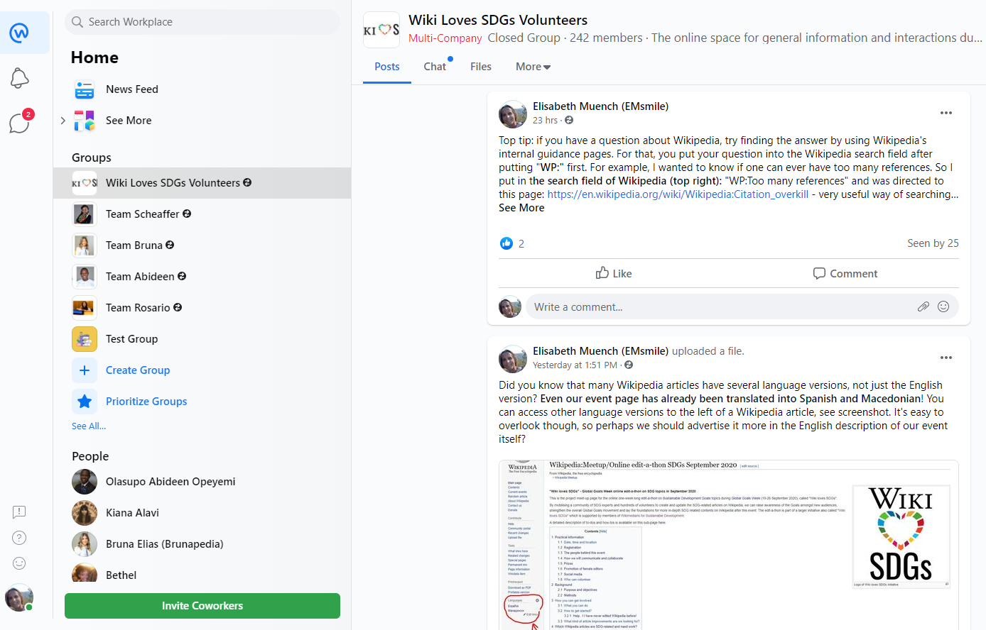 "위키는 지속 가능한 개발 목표를 사랑합니다" 이니셔티브는 지속 가능한 개발 목표와 관련된 주제에 대해 일주일간 온라인 에디터톤을 개최하였다. 이 행사는 2020년 9월 글로벌 목표 주간 동안 온라인으로 진행되었다. 영국에 있는 비정부 기구인 프로젝트 에브리원이 주최했으며, 약 300명의 등록 참가자, 108명의 활동적인 기여자, 64명의 신규 편집자가 참여했다. 대부분의 참가자는 개발 도상국 출신이었으며, 9명의 수상자 중 7명이 아프리카 출신이었다. 이 행사는 영어 위키백과에서 SDG 관련 콘텐츠를 개선하는 데 초점을 맞췄다(스페인어, 마케도니아어,[13] 카탈로니아어 및 포르투갈어 위키백과에도 일부 개선이 이루어졌다). 약 500개의 문서가 개선되었다.[14] 지미 웨일스가 폐회식에 참석하여 가장 적극적으로 참여한 자원봉사자들에게 9개의 상을 수여했다.[15]