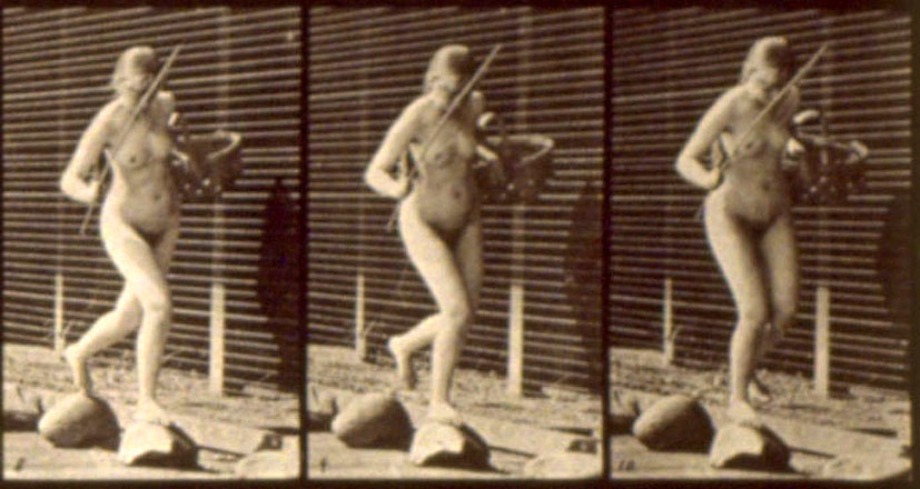 에드워드 머이브리지의 작품에서는 여성에게 연극 소품이 주어져 여성의 이미지는 간신히 가려진 에로티카가 되었다.[1]