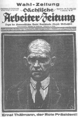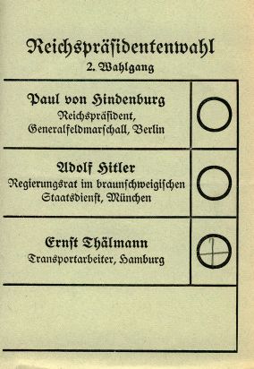 1932년 봄 대통령 선거에서 텔만은 "힌덴부르크에게 투표하는 것은 히틀러에게 투표하는 것과 같다. 히틀러에게 투표하는 것은 전쟁에 투표하는 것과 같다"라는 선거 슬로건을 내걸었다.[35]