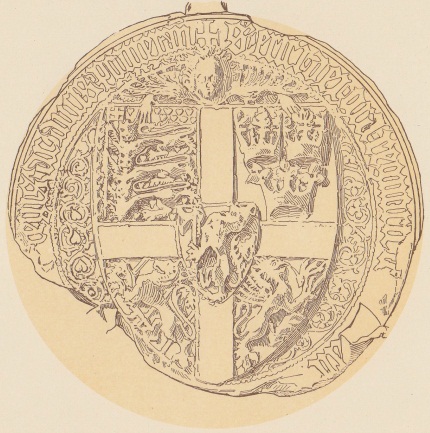 포메른의 에리크 왕의 왕실 인장 (1398) 묘사: (중앙): 도끼를 든 왕관을 쓴 사자 (노르웨이)가 십자가 위에 방패 안에 있음; 분기별: 덱스터 치프에, 세 마리의 사자가 겹쳐서 왕관을 쓰고 다네브로를 심장 문양으로 덮여 있음 (덴마크); 시니스터 치프에: 세 개의 왕관 (스웨덴 또는 칼마르 동맹); 덱스터 베이스에: 사자 (''폴쿵 사자'') (스웨덴); 그리고 시니스터 베이스에: 그리핀이 시니스터 방향으로 포효함 (포메라니아)