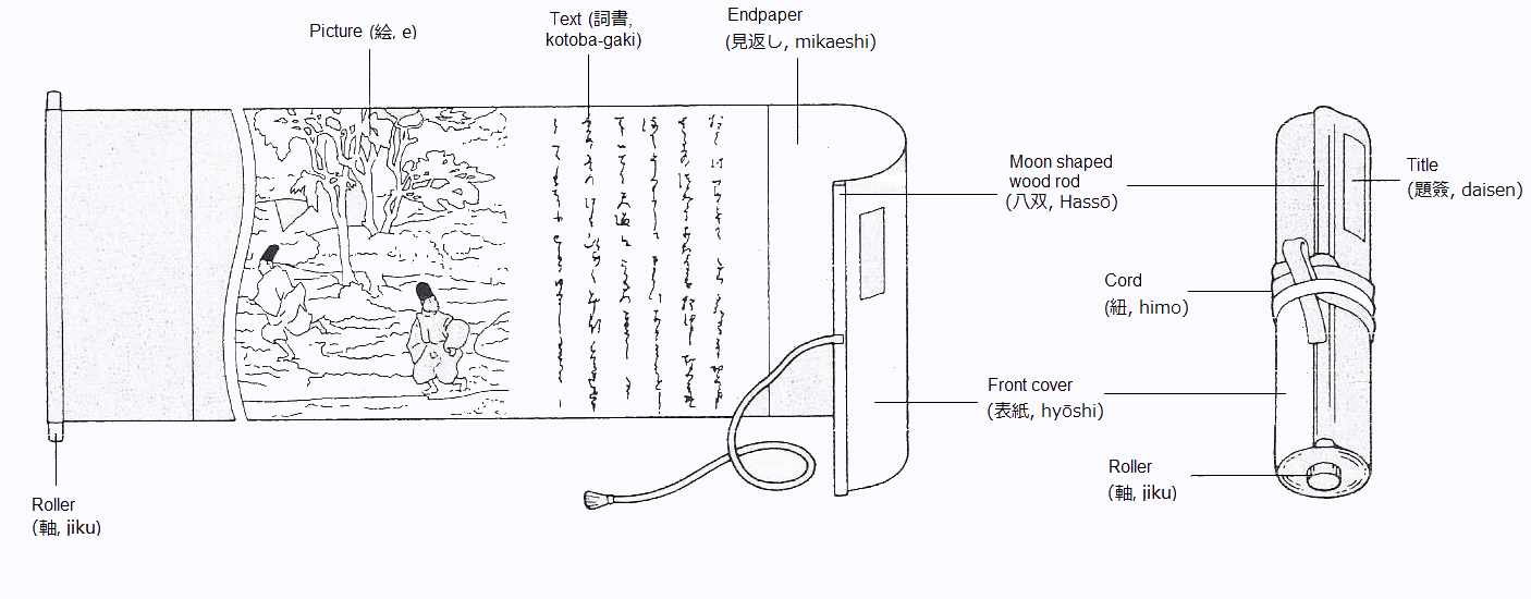emakimono|에마키모노|일본어는 kotoba-gaki|코토바가키|일본어로 알려진 서예 텍스트 부분과 e|에|일본어라고 하는 그림 부분의 두 가지 요소로 구성된다. 크기, 배치, 수는 시대와 작가에 따라 크게 다르다. 두루마리는 길이에 비해 높이가 제한되어 있다.