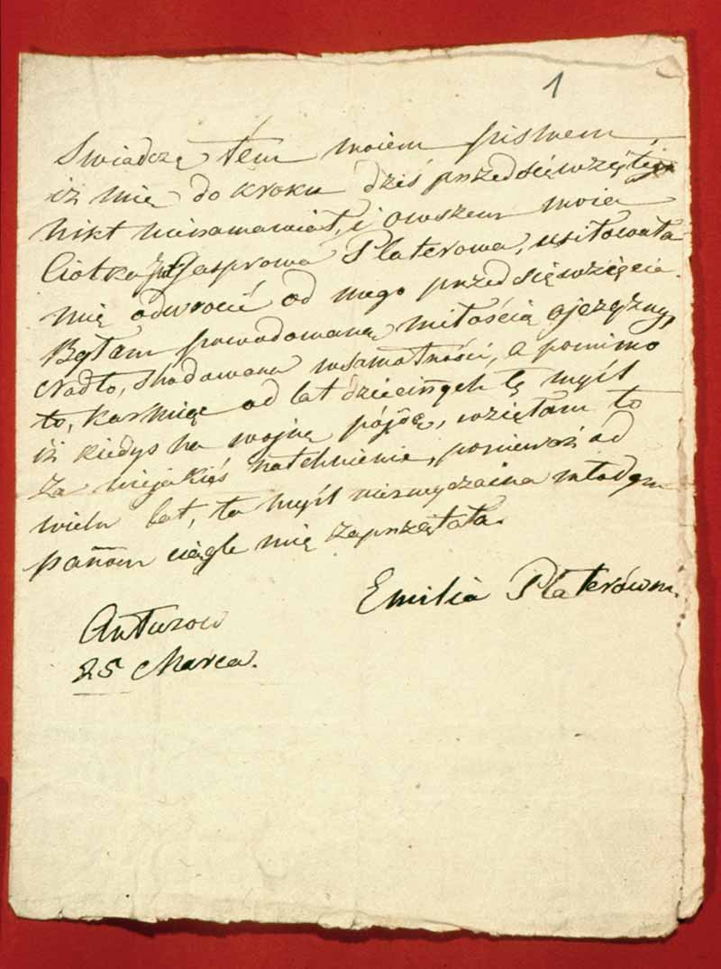1823년, 그녀의 사촌 중 한 명이 5월 3일 헌법을 기념했다는 이유로 처벌받아 강제로 러시아 제국군에 징집되었다. 이 사건은 그녀의 삶에서 중요한 사건 중 하나였으며, 그녀의 친 폴란드 및 반 러시아 태도를 촉진한 계기가 되었다고 한다. 1829년, 플라테르는 역사적인 폴란드-리투아니아 연방 전역을 여행하며 바르샤바와 크라쿠프를 방문했고, 라쉰 전투의 격전지를 방문했다. 그녀의 어머니는 1년 후 사망했고, 그녀의 아버지는 재혼하여 딸을 만나는 것조차 거부했다.