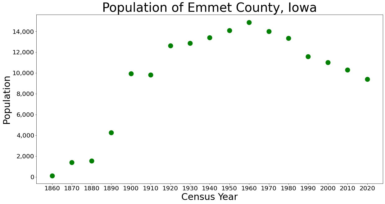 에밋군의 인구는 1860년 105명에서 1960년 14,871명으로 정점을 찍은 후 감소하여, 2018년에는 9,253명,[23] 2023년에는 9,229명으로 추정된다.[6]