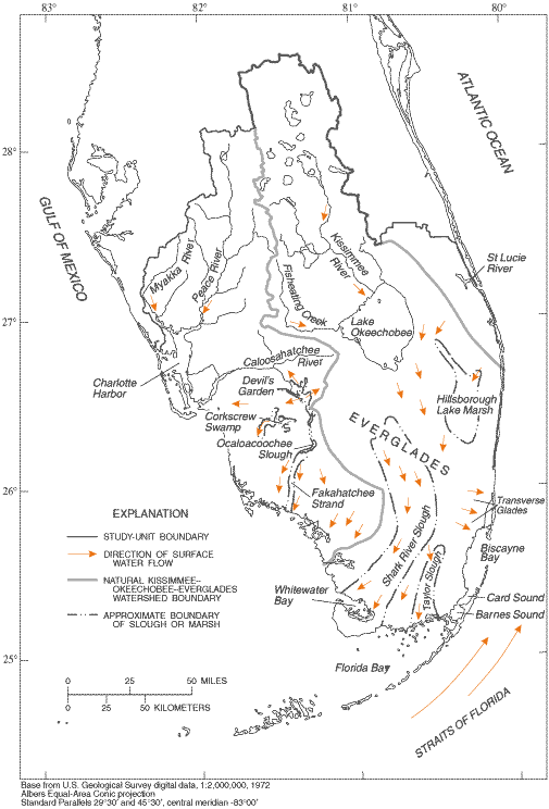올랜도에서 플로리다 반도 끝까지의 지역은 한때 단일 배수 지역이었다. 강수량이 오키초비 호수와 키시미 강 범람원의 수용력을 초과하면 넘쳐 플로리다 만으로 남서쪽으로 흘러갔다. 플로리다의 도시 및 농업 개발 이전에는 에버글레이즈가 오키초비 호수 남쪽 가장자리에서 시작하여 약 160 km에 걸쳐 멕시코 만으로 유입되었다. 석회암 대지가 넓고 약간 경사진 형태이며, 대부분의 강에서 볼 수 있는 좁고 깊은 수로의 특징은 없다. 오키초비 호수에서 플로리다 만까지의 수직 경사는 마일당 약 5 cm로, 약 97 km 폭의 넓은 강이 하루에 약 0.8km 이동하는 거의 평평한 지형을 만들어낸다.[24] 이처럼 넓고 얕은 강의 느린 움직임을 시트흐름(sheetflow)이라고 하며, 에버글레이즈에 "풀의 강(River of Grass)"이라는 별명을 안겨주었다.[24] 오키초비 호수를 떠난 물은 최종 목적지인 플로리다 만에 도착하는 데 몇 달 또는 몇 년이 걸릴 수 있다. 시트흐름은 매우 느리게 이동하기 때문에 물은 일반적으로 다공성 석회암 기질에 습윤기에서 다음 습윤기까지 저장된다. 물의 간헐적인 흐름은 에버글레이즈의 추정 5,000년 역사 동안 남부 플로리다의 지형과 모든 생태계를 형성해 왔다. 물의 움직임은 식물 군집과 동물들이 서식지와 먹이원에 적응하는 방식을 결정한다.[25]