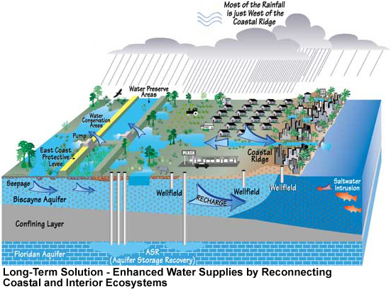 마이애미, 포트로더데일, 웨스트팜비치의 대도시 지역은 플로리다 동부 해안을 따라 마이애미 암초 능선이라고 불리는 고지대에 위치해 있으며, 이는 아나스타시아층 위에 퇴적된 잔존 오올라이트 여울이다.[18] 빅 사이프러스 습지의 서쪽 경계를 따라서는 칼루사해치 강과 빅 사이프러스 사이의 유출을 나누는 약간 높은 압축된 모래 지대인 이모콜리 능선(또는 이모콜리 고지)이 있다.[19] 에버글레이즈 양쪽의 이러한 약간의 고도 상승은 분지를 만들고, 레이크 오키초비에서 넘쳐흐르는 물이 남서쪽으로 흘러가도록 한다.[20] 마이애미 석회암 지층과 포트 톰슨 석회암 아래에는 비스케인 대수층이 있는데, 이는 마이애미 대도시권의 담수원으로 기능하는 지표수 대수층이며, 에버글레이즈의 강우량과 저장된 물은 비스케인 대수층을 직접 보충한다.[15]