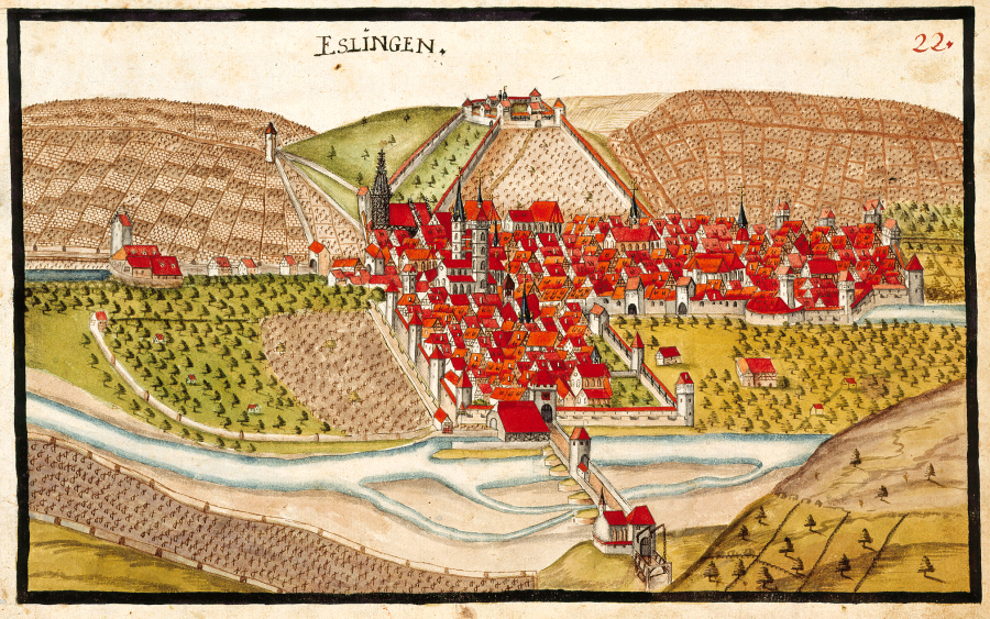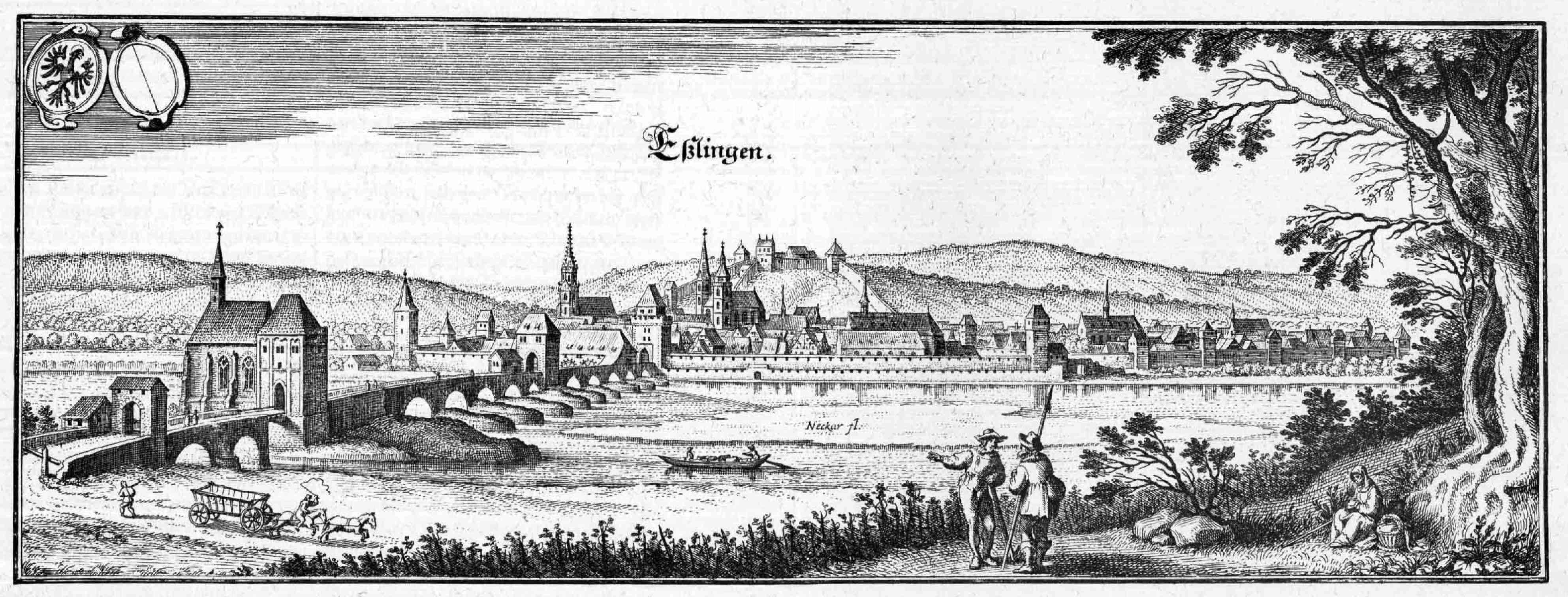Das frühe Mittelalter|ko|초기 중세 시대de의 알레만니족 시대 유물은 인근 필더 고원에서는 발견되었지만, 에슬링겐암네카어에서는 아직 발견되지 않았다. 뤼데른에서는 동방의 영향을 받은 유물이 있는 부유한 무덤이 발견되었는데, 예를 들어 세 개의 날개를 가진 창 머리 세트 등이 있다. "-ingen"으로 끝나는 이름은 아칠로, 헤칠로 또는 헤칠로라는 남자가 영주이자 가문의 가장으로서 영향력 있는 역할을 했던 사람들의 집단을 나타낸다. 이는 도시 이름이 원래 "아칠로의 사람들"을 의미했음을 뜻한다. 856년에는 '에즐링가', 866년에는 '헤칠링가'로 처음 기록된 이 이름은 오늘날의 에슬링겐이 되었다.[18]6세기에는 알레만니족이 클로비스 1세 치하의 메로빙거 왕조에 의해 정복당했다. 그러나 그들은 여전히 행정 업무를 맡았고 프랑크 왕국에서 공작령을 형성했다. 8세기에는 다시 주권을 되찾으려 했지만, 칸슈타트 근처에서 실패했다. 알레만 공작령의 종말은 ''칸슈타트 공의회''로 특징지어진다.