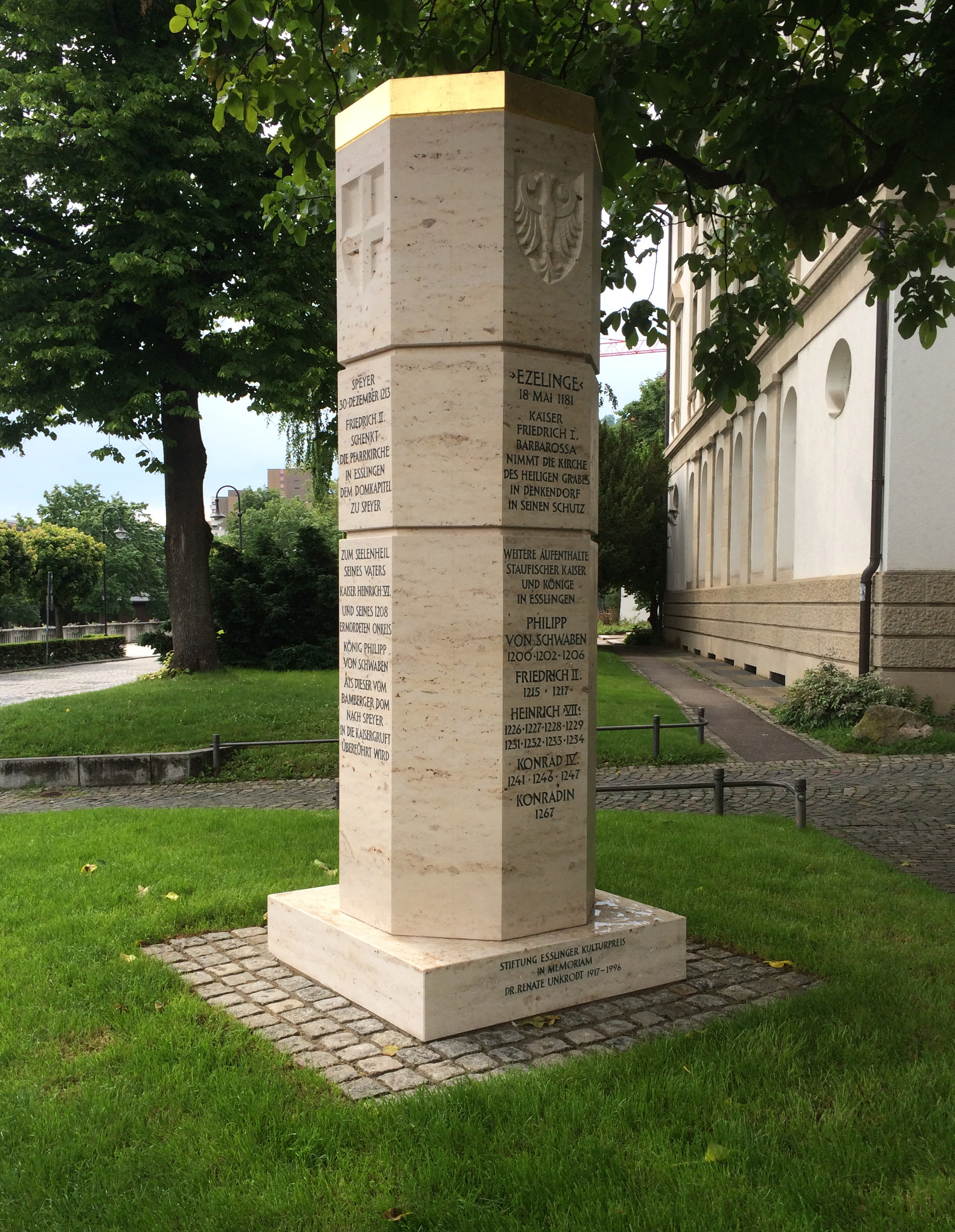 1213년 12월 30일, 프리드리히 2세는 에슬링겐의 성 디오니시우스 시 교회를 그 맞은편에 위치한 농장과 함께 슈파이어 대성당 참사회에 기증했다. 아프트-풀라트 거리 3번지의 라틴어 학교 앞의 슈타우펜 기둥은 2016년에 이 사건을 기념하여 세워졌다[19]。에슬링겐에서는 13세기에 많은 큰 건물이 건설되기 시작했다. 수도원이 세워졌고, 네카어 강에 놓인 다리가 이 시기에 놓였으며, 성 비탈리스 교회가 확장되었다. 1229년에 처음으로 에슬링겐의 도시 권한과 수장 직책에 대해 기재되어 있다.
