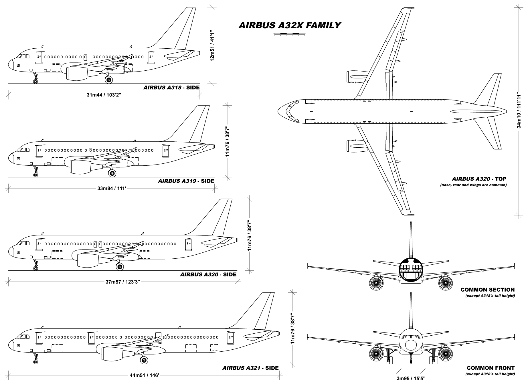 에어버스 A321은 좁은 동체(단일 통로) 항공기로, 접이식 삼륜 착륙장치를 갖추고 있으며 날개에 장착된 두 개의 터보팬 엔진으로 추진된다. 수직 안정판과 방향타를 가진 일반적인 꼬리 날개를 가진 저익 캔틸레버 단엽기이다. A320과의 차이점은 동체 연장과 날개의 일부 수정이다. 동체는 날개 앞쪽에 4.27m, 뒤쪽에 2.67m 길이로 연장되어 A321이 A320보다 길어졌다.[3][13][6][14] 늘어난 길이 때문에 A320의 날개 위 창문 출구는 문 출구로 변경되어 날개 앞뒤로 재배치되었다.[15] 성능 유지를 위해 이중 슬롯 플랩과 후미 수정이 포함되었으며,[6] 날개 면적은 124m2에서 128m2로 증가했다.[16] 중앙 동체와 차대는 최대 이륙 중량이 9600kg 증가하여 83000kg에 이르도록 보강되었다.[6]3. 3. 객실 및 화물칸