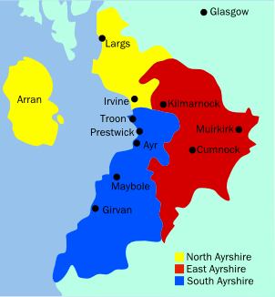 - 북쪽의 커닝엄: 왕립 자치구 이르바인이 포함되어 있으며, 이르바인 강 북쪽에 위치한 카운티의 일부였고, 일반적으로 평평하고 비옥한 지역에 위치해 있었다.[2]