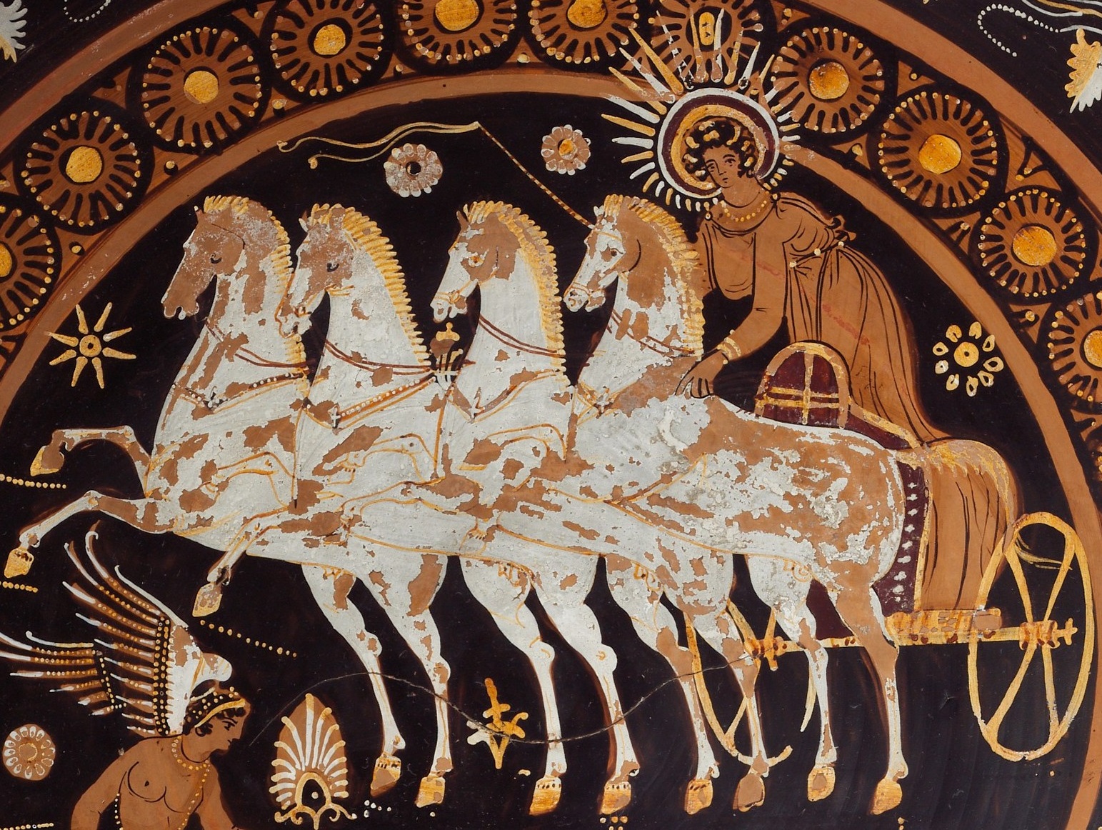그리스 신화에서 에오스, 헬리오스, 제우스는 어원과 지위 모두에서 완벽한 인도-유럽인 계보를 가진 세 신으로 여겨진다.[13] 이 새벽 여신과 관련된 일반적인 칭호는 *''Diwós Dhuǵh2tḗr'', 즉 '디예우스의 딸', 하늘의 신이다.[14] 그러나 호머의 전통에서는 에오스가 제우스의 딸(Διὸς θυγάτηρ|Διὸς θυγάτηρgrc)이라고 언급되지 않고, 신화나 종교에서 거의 역할을 하지 않는 티탄 히페리온의 딸로 묘사된다. 오히려 그녀의 일반적인 칭호는 δῖα|dîagrc 즉, "신성한"을 의미하며, 이는 이전의 ''*díw-ya''에서 유래하여 "제우스에게 속한" 또는 "천상의"로 번역될 수 있다.[15]