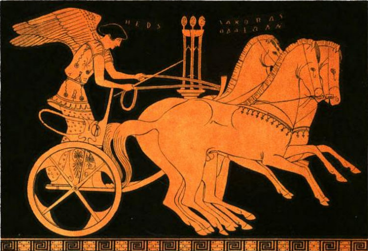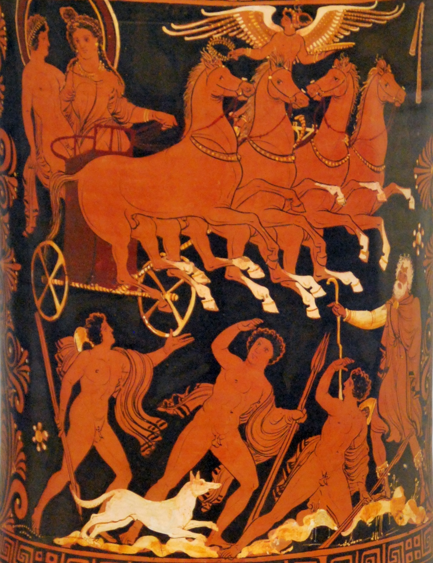 에오스의 말들은 하늘을 가로질러 그녀의 전차를 끌고 가는데, 이 말들은 『오디세이』에서 "불빛나는 자"와 "낮빛나는 자"로 불린다. 퀸투스는 밝은 머리카락을 가진 호라이들, 즉 계절의 변화를 관장하는 제우스와 테미스의 딸들 사이에서, 그녀의 전차를 끄는 빛나는 말들(람푸스와 파에톤)을 마음속으로 기뻐하는 에오스를 묘사했다. 그들은 하늘의 아치를 오르며 불꽃을 흩뿌렸다.[58]6. 3. 연인들