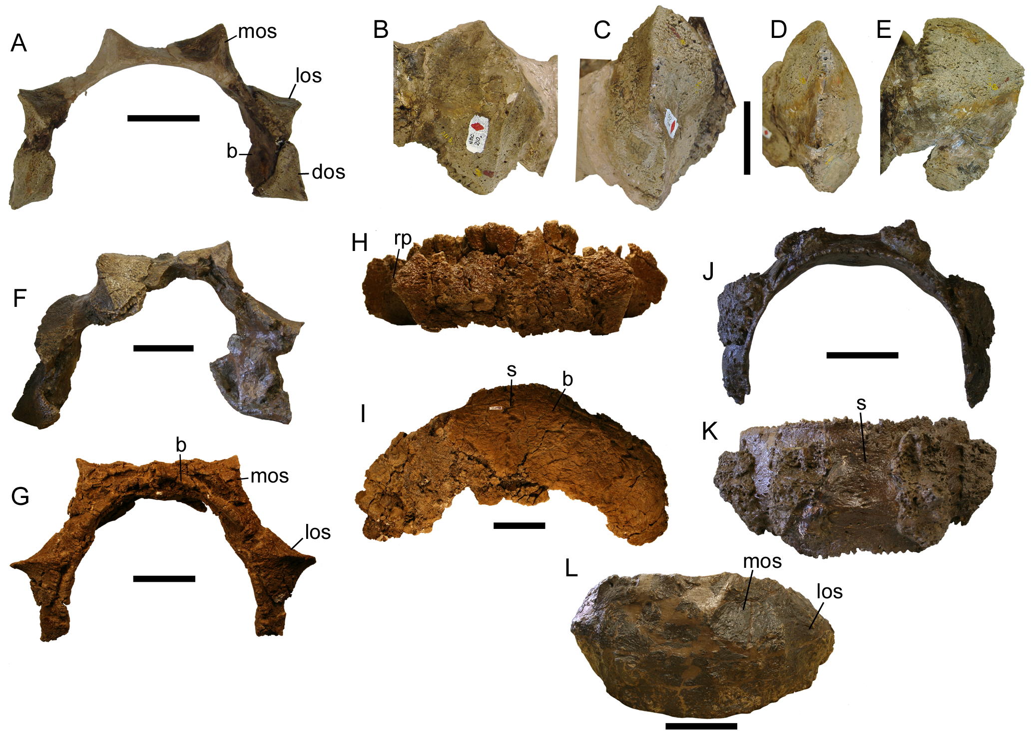 상완골은 매우 넓은 상하 관절과 좁은 자루로 결합되어 매우 튼튼하다. 위쪽 자루에는 거대한 삼각근능선이 존재한다. 아래쪽 팔에서 튼튼한 척골은 잘 발달된 주두돌기를 가지고 있다. 골반에서 장골의 앞쪽 날은 앞쪽으로 펼쳐져 복부의 가장 넓은 지점까지 뻗어 내장을 지지한다. 장골의 뒤쪽 날은 엉덩이 소켓의 직경보다 짧다. 치골은 알려져 있지 않다. 좌골은 짧고 굽어 있으며 수직으로 위치한 뼈 끈이다. 허벅지뼈는 짧고 튼튼하며 곧고 자루의 중간점 아래에 위치한 낮은 제4전자가 있다. 튼튼한 정강이뼈는 허벅지뼈보다 짧다. 발은 잘 알려져 있지 않지만, 날카로운 발톱 대신 발굽 모양의 기능적으로 삼지형이다.[20]