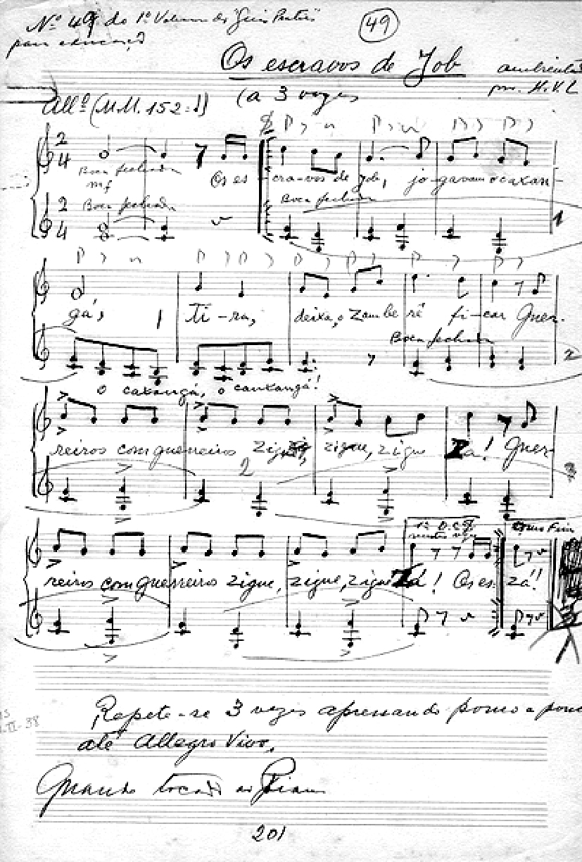 지금까지 언급된 모든 요소들은 빌라로부스의 9중주곡 "전 브라질의 빠른 인상(Impressão rápida do todo o Brasil)"에 융합되어 있다. 이 작품은 표면적으로는 실내악이지만, 대규모 타악기, 그리고 혼성 합창단을 위한 편곡이다.