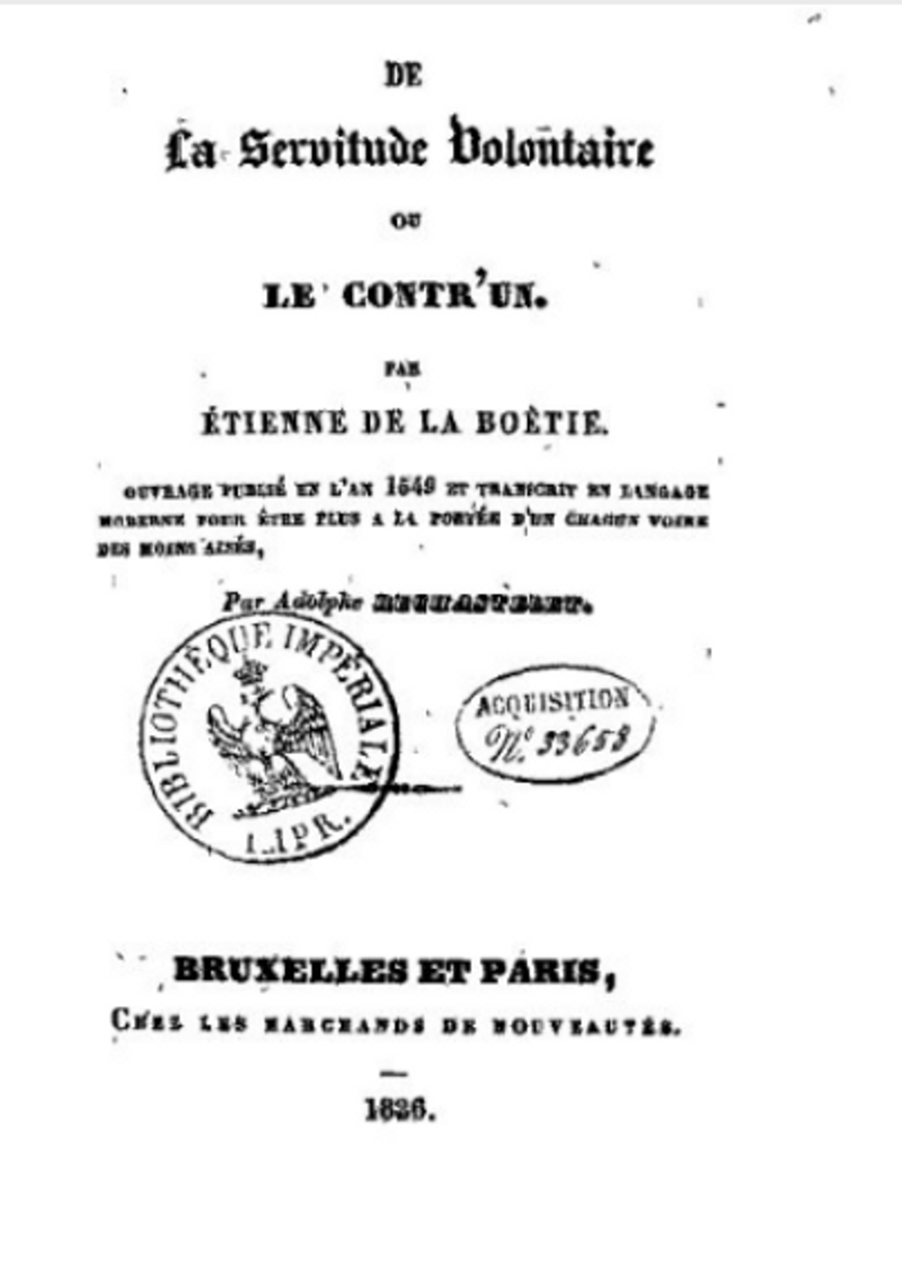 “압제는 지배받는 자의 자발적인 예속에 의해 영속한다”는 지배·피지배 구조의 본질을 간파한 것으로 여겨진다.[11] 이 논문은 필사본으로 당시 지식인들 사이에서 널리 읽혔다. 이후에도 대혁명 시기인 1789년과 1792년에 재출판되었다.