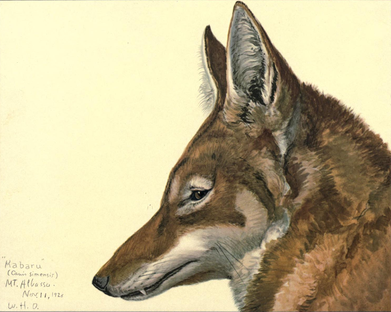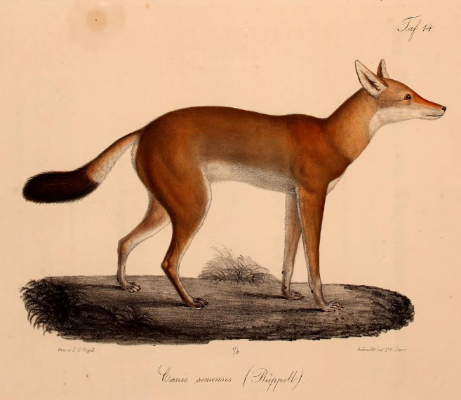 이 종은 1835년 에두아르트 뤼펠이 처음 과학적으로 기술했으며, 그는 대영 박물관에 두개골을 제공했다.[8][9][10] 19세기 중반 아비시니아(당시 유럽인들이 부르던 명칭)를 여행한 유럽 작가들은 원주민들이 이 동물의 가죽을 절대 입지 않았다고 기록했는데, 이는 늑대 털이 열린 상처에 들어가면 착용자가 죽을 것이라는 믿음 때문이었다고 한다.[11] 찰스 다윈은 이 종이 그레이하운드의 기원이 되었다는 가설을 세웠다.[12] 20세기 초까지 유럽에서는 이 종에 대한 소식이 거의 들리지 않다가, 퍼시 파월-코튼 소령이 아비시니아를 여행하면서 여러 가죽을 영국으로 보냈다.[9][10]