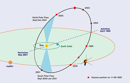 율리시스호의 두 번째 궤도: 1992년 2월 8일 목성에 도착하여 스윙바이 기동을 통해 황도면에 대한 궤도 경사각을 80.2도로 증가시켰다.