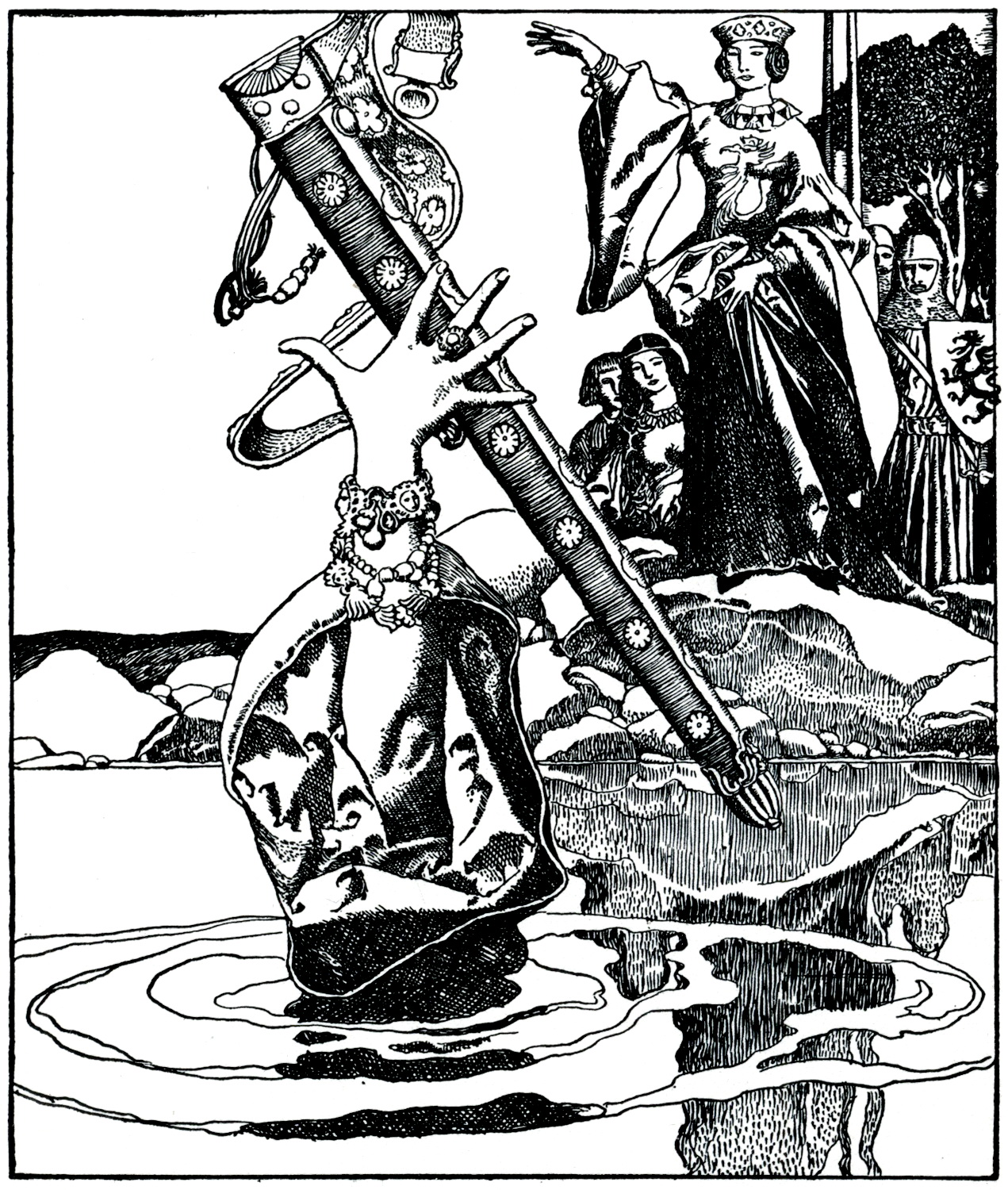 모드레드와의 전투에서 치명상을 입은 아서왕은 베디비어 경에게 엑스칼리버를 호수에 던지라고 명령했다. 베디비어 경은 처음에는 망설였지만, 결국 엑스칼리버를 호수에 던지자 요정의 손이 나타나 검을 받아들고 사라졌다.