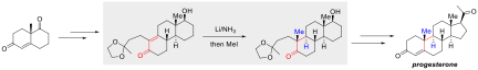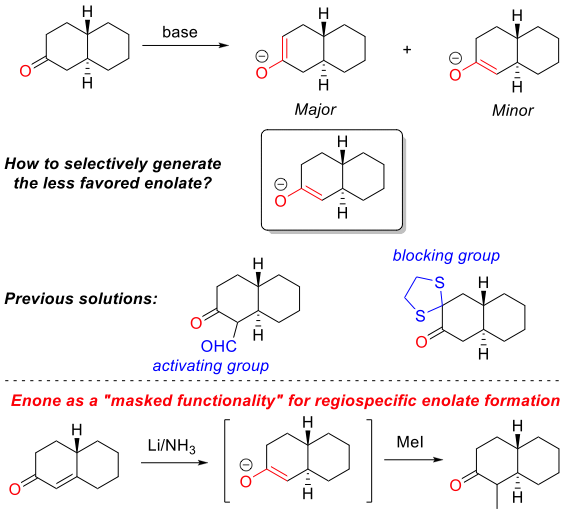 위치선택적 에놀레이트 생성에 대한 "가리개 작용기" 접근 방식은 천연물의 전합성에 널리 사용되어 왔다. 예를 들어, 스테로이드 호르몬 프로게스테론의 전합성에서 스토크와 공동 연구자들은 "가리개 작용기"를 사용하여 분자 내 사차 탄소 중 하나를 입체 특이적으로 구성했다.[23]