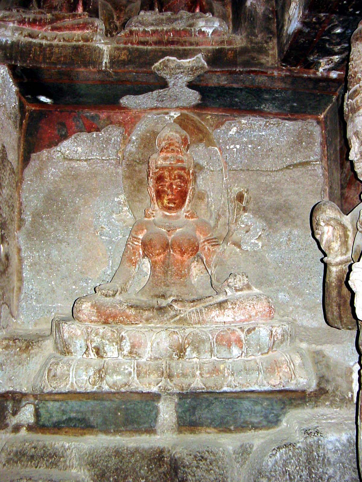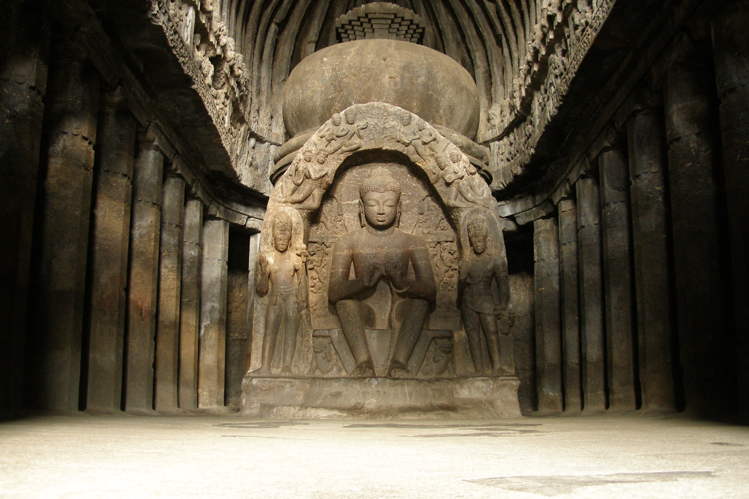 엘로라 석굴의 불교 석굴 중 주목할 만한 곳은 서기 650년경에 지어진 '비슈바카르마 석굴'이라고 불리는 차이티야 예배당인 제10굴이다.[28] 이 석굴은 바위에 나무 기둥과 같은 마감을 하여 '목수의 석굴'이라고도 알려져 있다. 여러 층으로 된 입구 너머에는 대성당과 같은 탑 홀이 있으며, 이는 '차이티야-그리하'(기도실)로도 알려져 있다. 이 석굴의 중심에는 설법 자세로 앉아 있는 약 4.57m 높이의 부처상 조각이 있다.