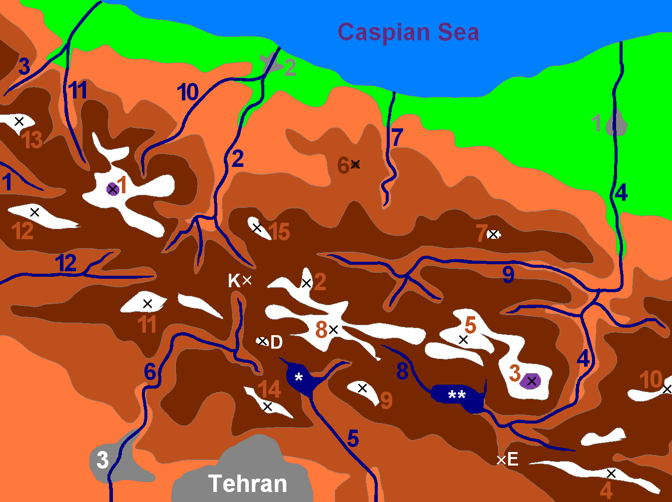 - 도시: 아몰(1), 찰루스(2), 카라지(3) (괄호 안 숫자는 지도상의 위치)