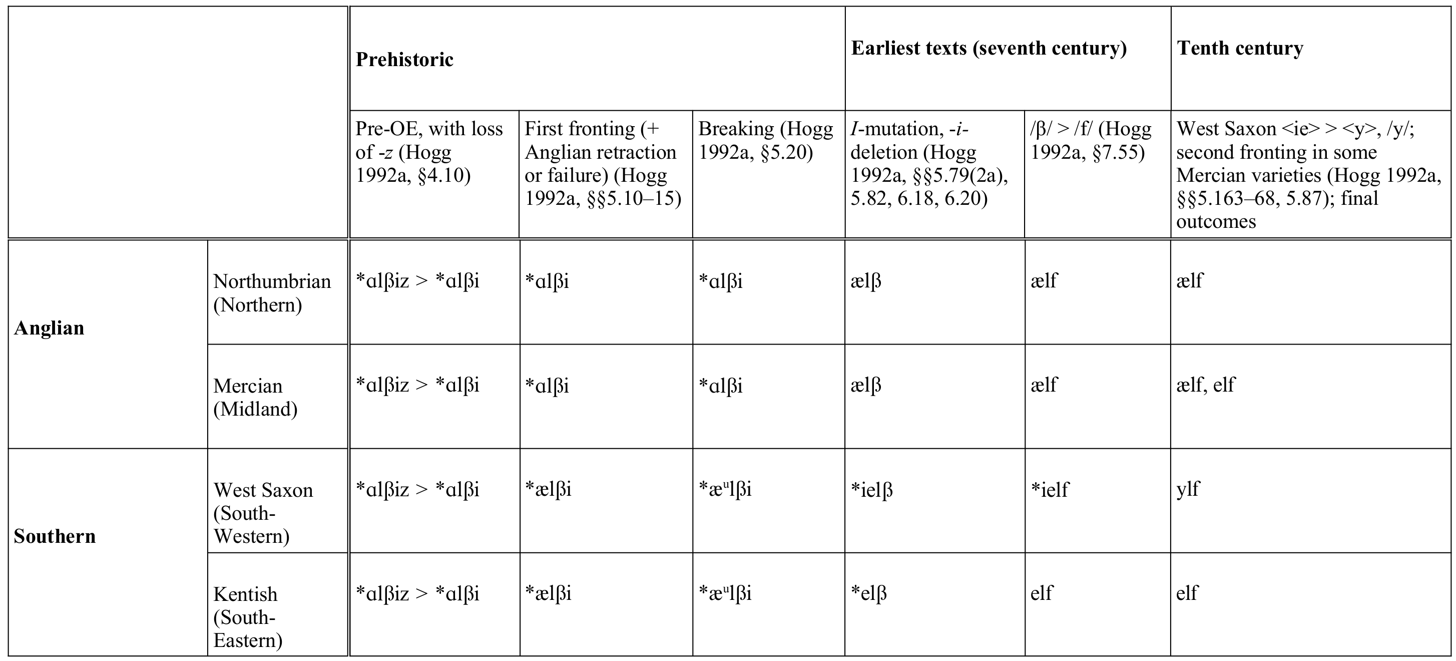 신과 인간을 위한 단어와 마찬가지로, "엘프(elf)"라는 단어는 괴물이나 악마를 위한 단어가 사용되지 않는 고유명사에서 사용된다.(Hall 2007, pp. 55–62) 고대 노르웨이어의 ''álfar''가 아시르와 관련된 것처럼, 고대 영어 ''Wið færstice''는 엘프를 ''ēse''와 관련짓는다. 이 단어가 10세기까지 어떤 의미를 지녔든 어원적으로 이는 이교 신들을 나타냈다.(Hall 2007, pp. 35–63) 고대 영어에서 복수형 ylfeang (''베오울프''에서 증명됨)는 문법적으로 민족명(민족 집단을 위한 단어)이며, 엘프가 사람으로 여겨졌다는 것을 시사한다.[11] 의학 관련 텍스트에 등장하는 것 외에도, 고대 영어 단어 ''ælf''와 그 여성형 파생어 ''ælbinne''는 주석에서 라틴어 님프 단어를 번역하는 데 사용되었다. 이것은 매혹적으로 아름다운 성경의 여주인공인 사라와 유딧을 묘사하는 데 사용된 "요정처럼 아름다운(ælfscȳne)"이라는 단어와 잘 어울린다.(Hall 2007, pp. 75–95)