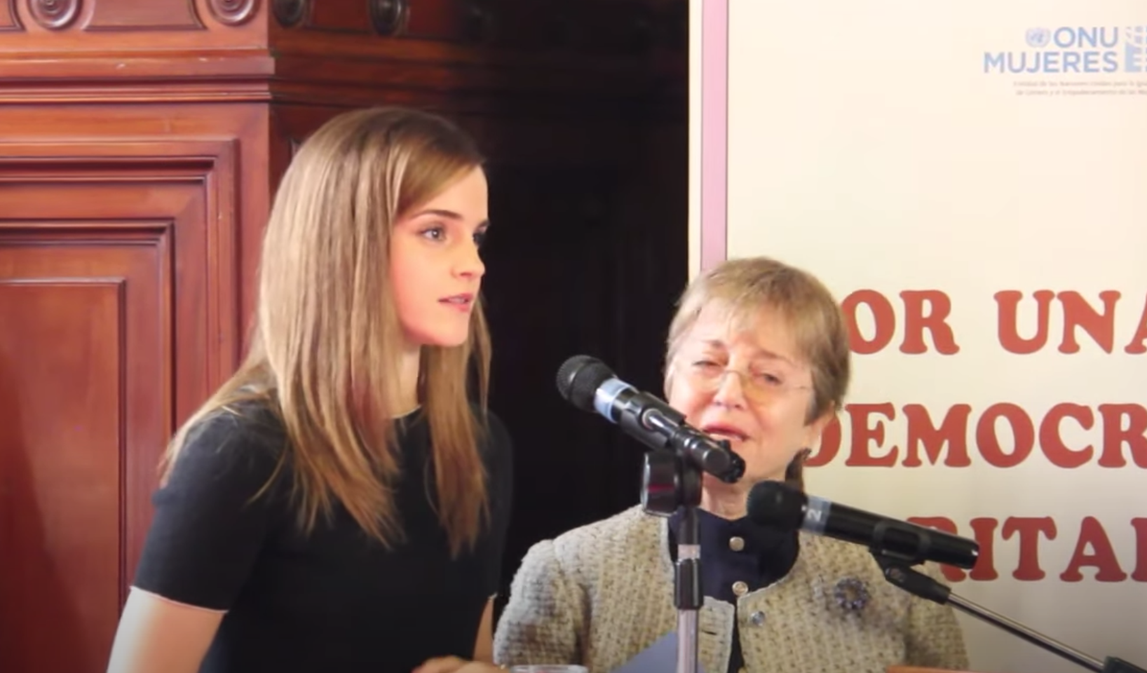왓슨은 소녀들의 교육 증진을 위해 방글라데시와 잠비아를 방문한 바 있다.[467][160] 2014년 7월, UN Women 친선대사로 임명되었다.[468][161] 같은 해 9월, 뉴욕 UN 본부에서 열린 양성평등 지지 캠페인 HeForShe 출범 행사에서 연설을 하였다.[470][157] 이 연설에서 왓슨은 8세 때 학부모 연극 연출을 맡으려 했을 때 '남자처럼 나댄다(bossy)'는 말을 듣고 혼란스러웠던 경험,[469][162] 14세 때 언론으로부터 성적 대상화를 경험한 것,[162][163] 15세 때 여자 친구가 근육질로 보이기 싫다는 이유로 스포츠팀을 그만둔 사례 등을 언급하며 성별에 따른 고정관념에 의문을 제기하기 시작했다고 밝혔다.[470] 그녀는 페미니즘을 "남성과 여성이 동등한 권리와 기회를 가져야 한다는 믿음"으로 정의하며, 정치적, 경제적, 사회적 평등을 의미한다고 강조했다.[470][157] 또한 페미니즘이 '남성 혐오'와 동일시되는 현실을 비판하며, 이러한 인식을 바꿔야 한다고 주장했다.[470][157] 왓슨은 연설에서 "우리는 모두 성별을 두 개의 상반된 이상이 아닌 스펙트럼으로 인식해야 할 때"라며, "남성들이 이 멍에를 짊어지기를 바랍니다. 그러면 그들의 딸, 누이, 어머니는 편견으로부터 자유로워질 수 있을 뿐만 아니라 아들들도 취약하고 인간적인 모습을 드러낼 수 있는 허락을 받게 될 것이고 [...] 더 진실하고 완전한 자신의 모습이 될 수 있습니다."라고 말하며 더 많은 남성들의 동참을 촉구했다.[157] 이 연설은 전 세계 언론의 주목을 받았으며, 행사 이후 UN Women 웹사이트가 마비되기도 했다.[109]