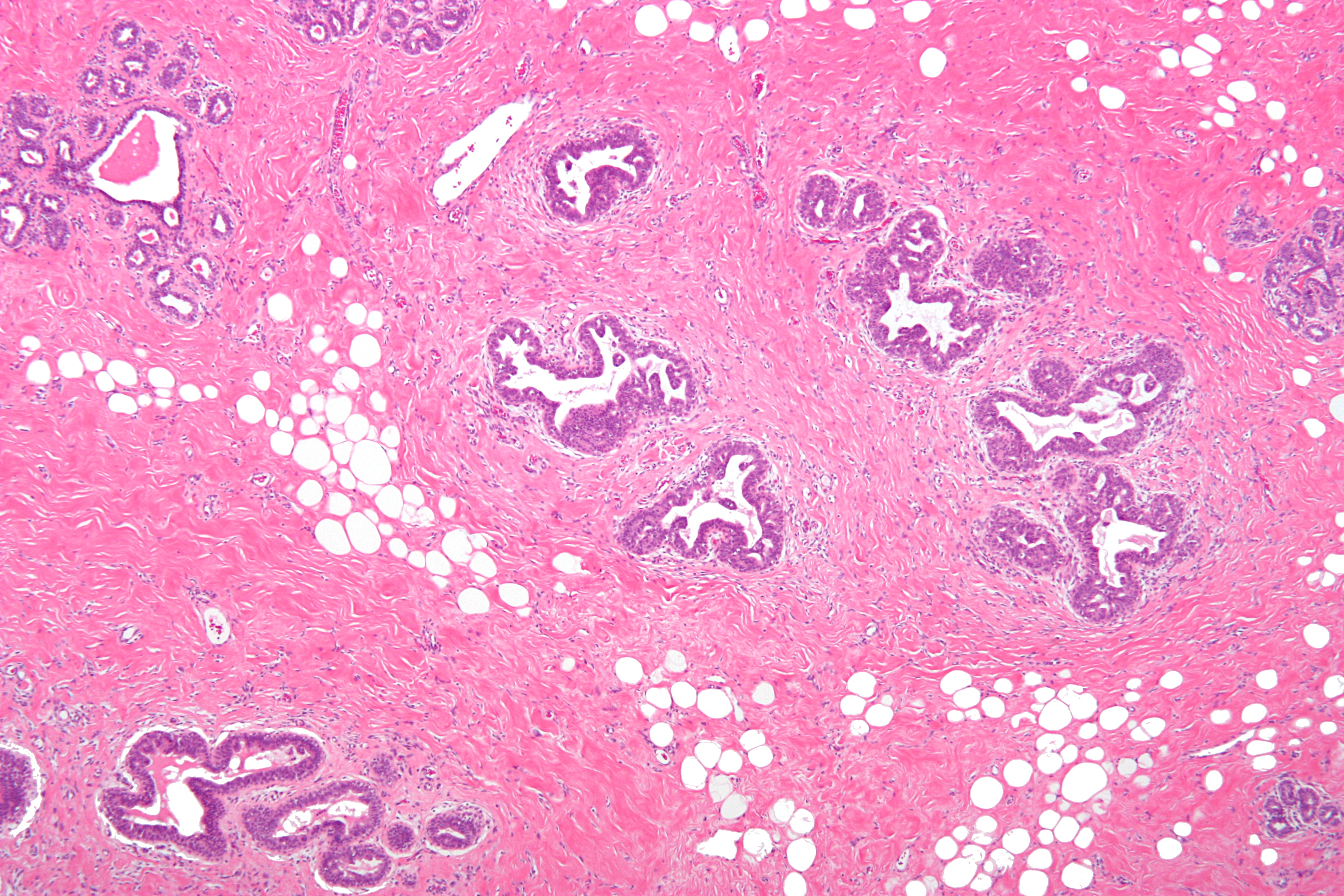 세침 흡인 생검으로 얻은 여성형유방증 조직을 검사할 때 나타나는 초기 조직학적 특징으로는 관의 증식 및 연장, 결합 조직 증가, 염증 증가, 관 주변의 부종 및 결합 조직 내 섬유아세포 증가가 예상된다.[21] 만성 여성형유방증은 결합 조직 섬유증 증가, 관 수 증가, 여성형유방증 급성기보다 염증 감소, 유륜하 지방 증가, 기질의 초자화 등과 같은 다른 조직학적 특징을 보일 수 있다.[54][21] 수술이 시행될 경우, 여성형유방증의 존재를 확인하고 현미경으로 종양을 검사하기 위해 일반적으로 샘플을 실험실로 보낸다. 남성 청소년 여성형유방증 환자에게서 제거된 유방 조직의 병리 검사의 유용성은 이 인구 집단에서 유방암이 드물기 때문에 최근 논란이 되고 있다.[68]