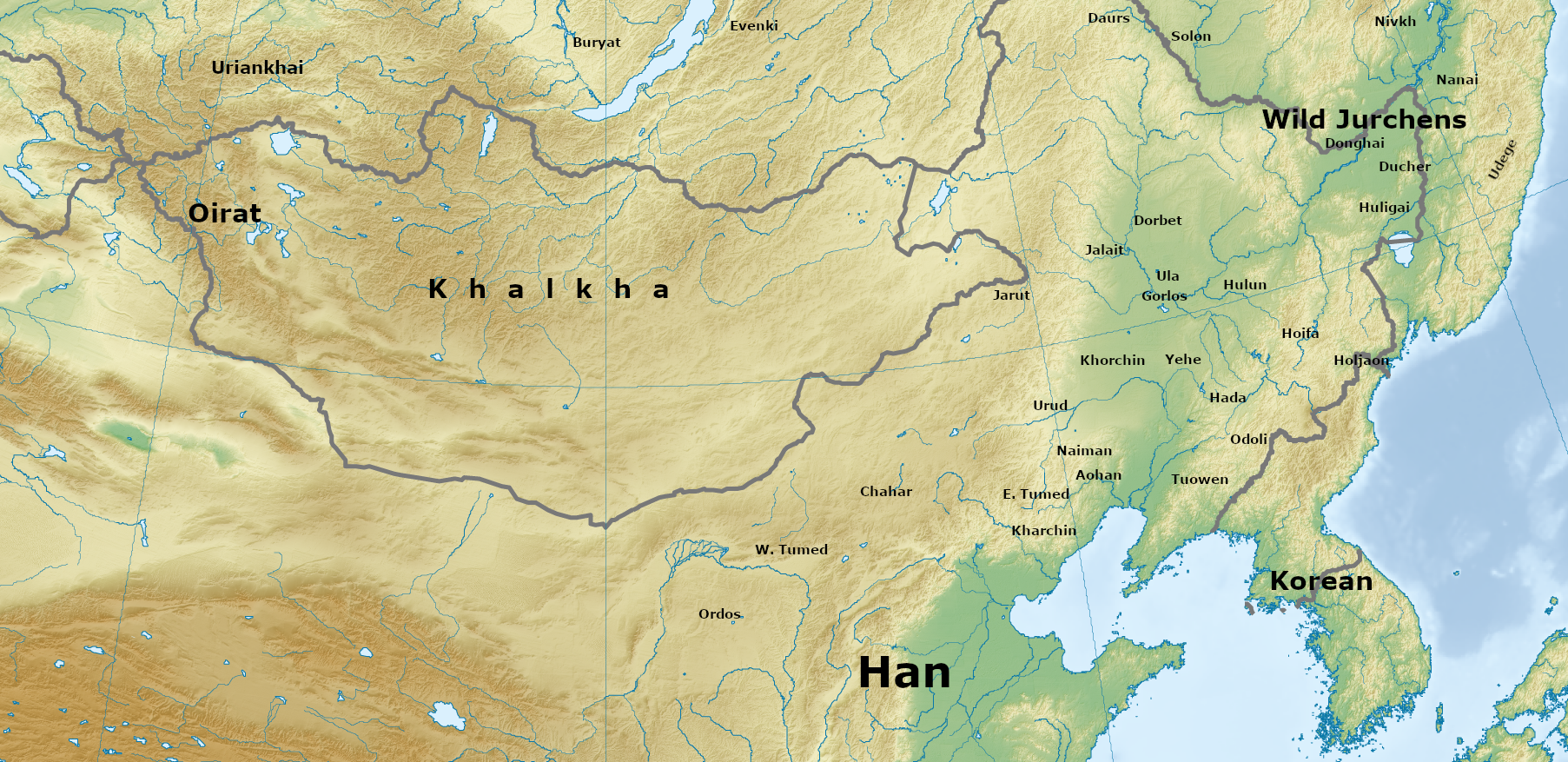 여진은 고대에 숙신, 읍루, 물길 등으로 불렸고, 고구려 통합 후에는 말갈로 불렸다. 발해 멸망 후 거란은 말갈을 여진이라 칭했는데, 이는 Jurchen의 음차이며 비칭일 가능성도 있다. 여진의 완안부(完顔部)는 1115년 금나라를 건국, 1234년까지 전성기를 누렸다. 금나라 멸망 후, 여진은 야인 여진(野人女眞), 해서 여진(海西女眞), 건주 여진(建洲女眞)으로 분리되었다.[36]