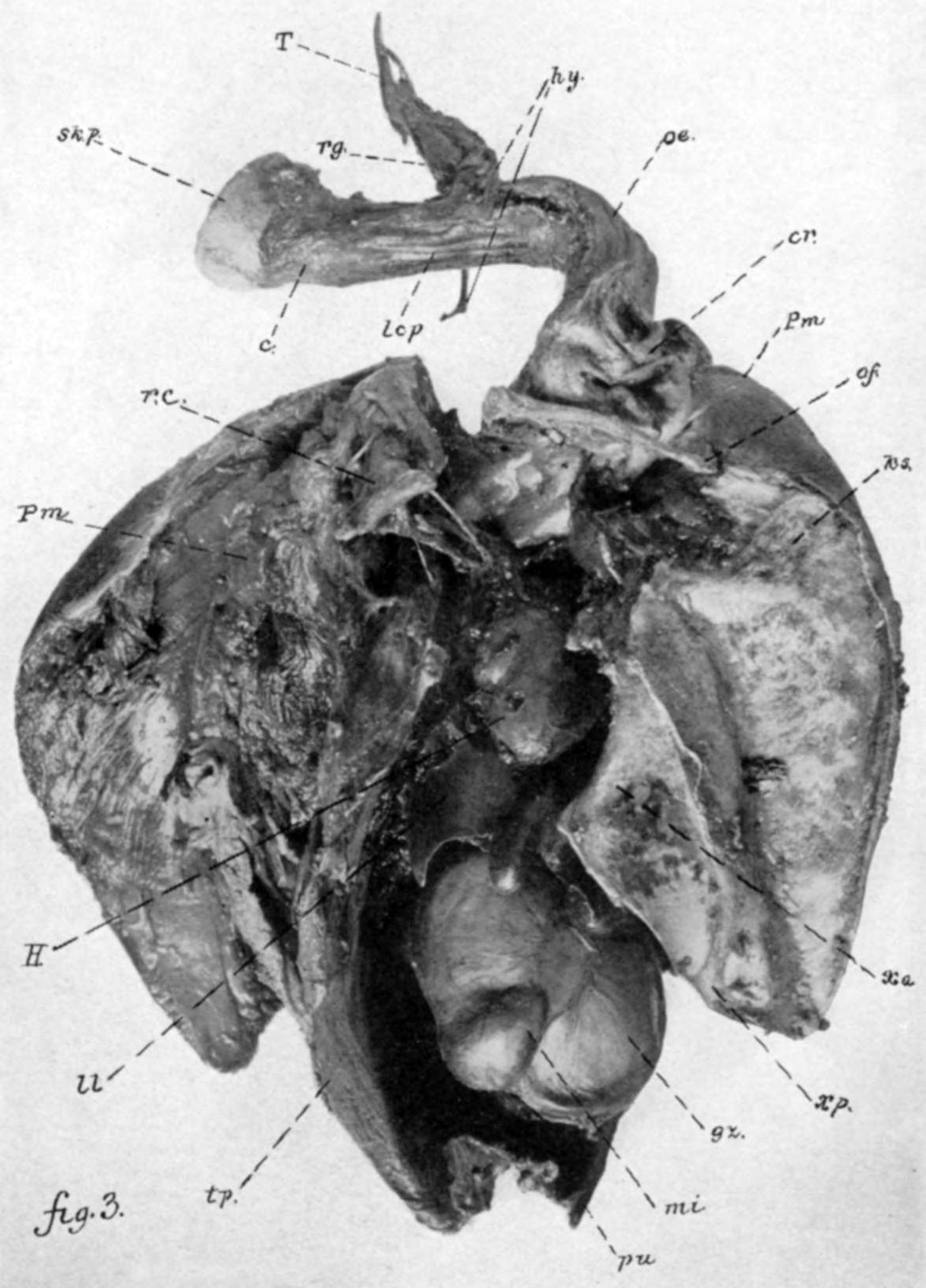 여행비둘기는 비행 시 속도, 지구력, 기동성에 신체적으로 적응했으며, 일반적인 바위비둘기와 같은 전형적인 비둘기 모양의 유선형 버전으로 묘사되었다. 날개는 매우 길고 뾰족했으며, 꼬리는 길고 쐐기 모양이었다. 몸은 가늘고 좁았고, 머리와 목은 작았다.[38][34][35] Robert W. Shufeldt는 1914년 수컷 골격을 검사했을 때 다른 비둘기와 조류의 osteology를 구별할 만한 점이 거의 없다는 것을 발견했지만, Julian P. Hume은 2015년 더 자세한 설명에서 몇 가지 뚜렷한 특징을 언급했다. 비둘기의 특히 큰 가슴 근육은 강력한 비행을 나타냈다. coracoid 뼈는 조류의 크기에 비해 컸으며, 다른 비둘기보다 더 곧은 샤프트와 더 강력한 관절 끝을 가지고 있었다. 쇄골은 더 날카로운 V자 모양이었고 더 강력했으며, 관절 끝이 확장되었다. 견갑골은 길고 곧고 튼튼했고, distal 끝이 확대되었다. 흉골은 다른 비둘기보다 매우 크고 튼튼했다.[35][36][37]