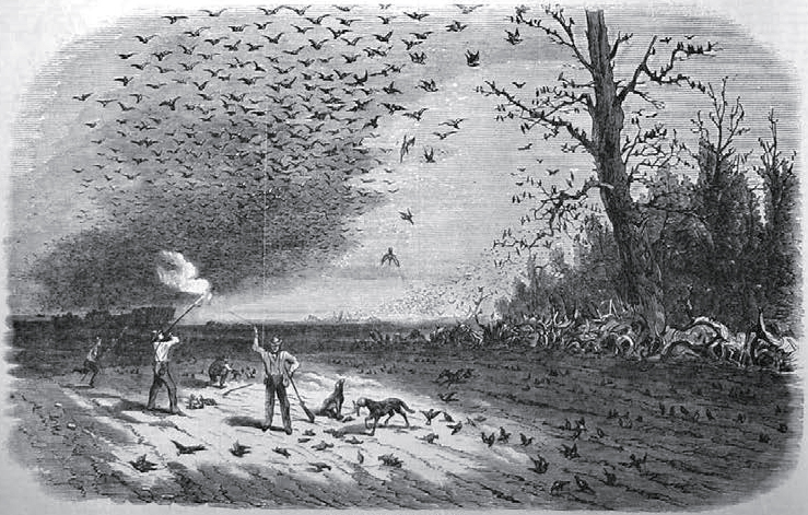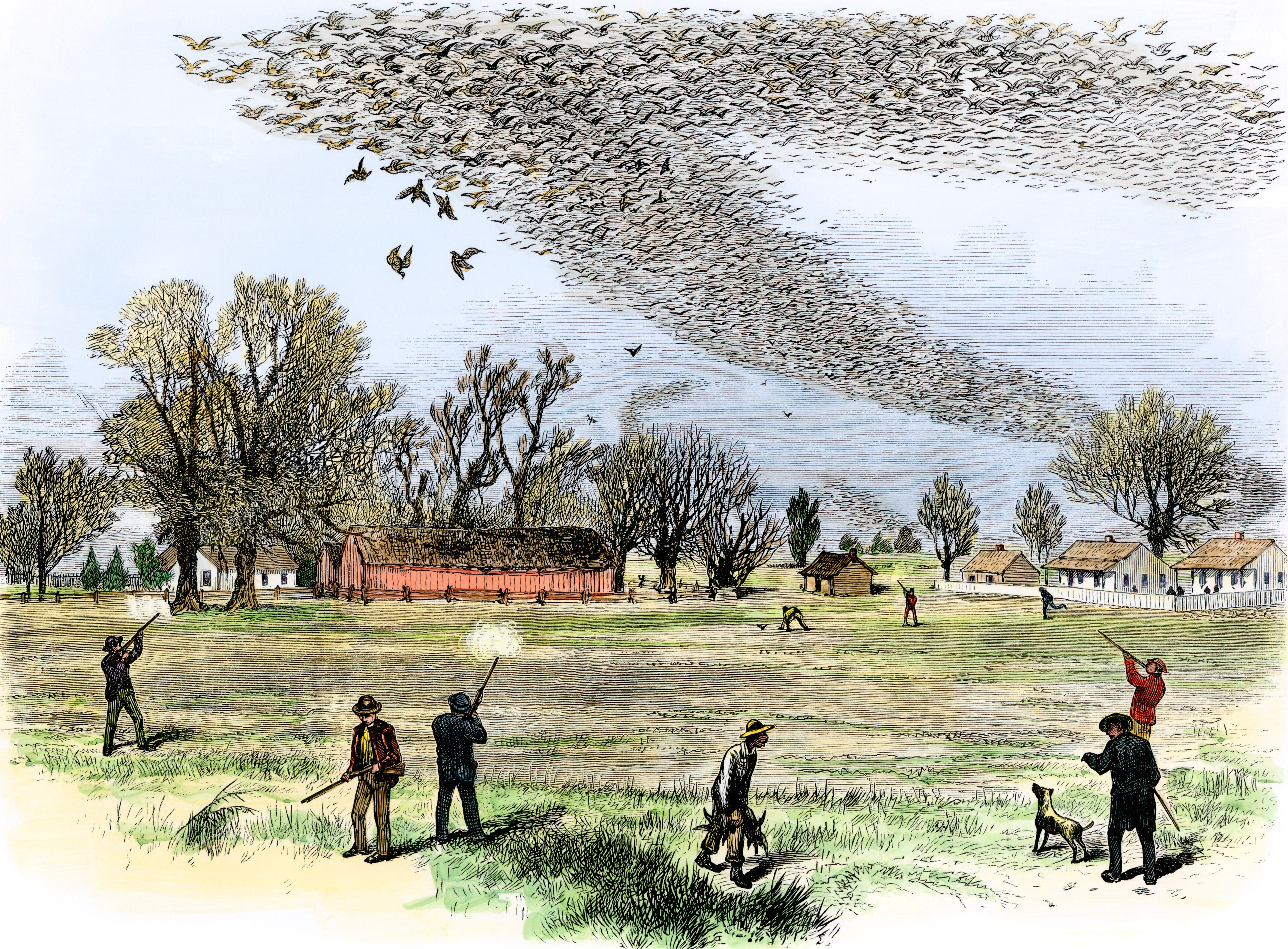 18세기 북아메리카 전역에는 50억 마리로 추정되는 여행비둘기가 서식했으며, 이는 세계에서 가장 많은 수였다. 그러나 19세기에 들어 흑인, 빈곤층, 노예를 위한 식용, 사료, 깃털 채취 목적으로 남획이 이루어져 개체수가 급감했다. 당시 자본가들은 여행비둘기를 돈벌이 수단으로 여겨 여행비둘기 고기를 기차로 수송하는 운송업을 하기도 했다. 막대한 개체수 때문에 멸종하지 않을 것이라는 무지로 인해 여행비둘기 보호는 진지하게 검토되지 않았다.여행비둘기 고기는 매우 맛있다고 알려져, 총, 새그물, 막대기를 사용해 많은 사람들이 포획을 실시했으며, 비둘기 사냥은 미 서부에서의 금 채취, 곡식 투기 등으로 벼락부자가 된 졸부에게는 일종의 '스포츠'였다. 여행비둘기 포획을 전문으로 하는 사냥꾼에 의해 조직적이고 대규모에 걸친 대량 학살이 이루어졌으며, 심지어 3만 마리를 사냥 대회에서 이기려고 죽인 사냥꾼도 있었다. 미국의 졸부들과 사냥꾼들은 여행비둘기를 생명을 가진 동물로서 존중하지 않고 놀이를 위한 장난감으로 여겼다.