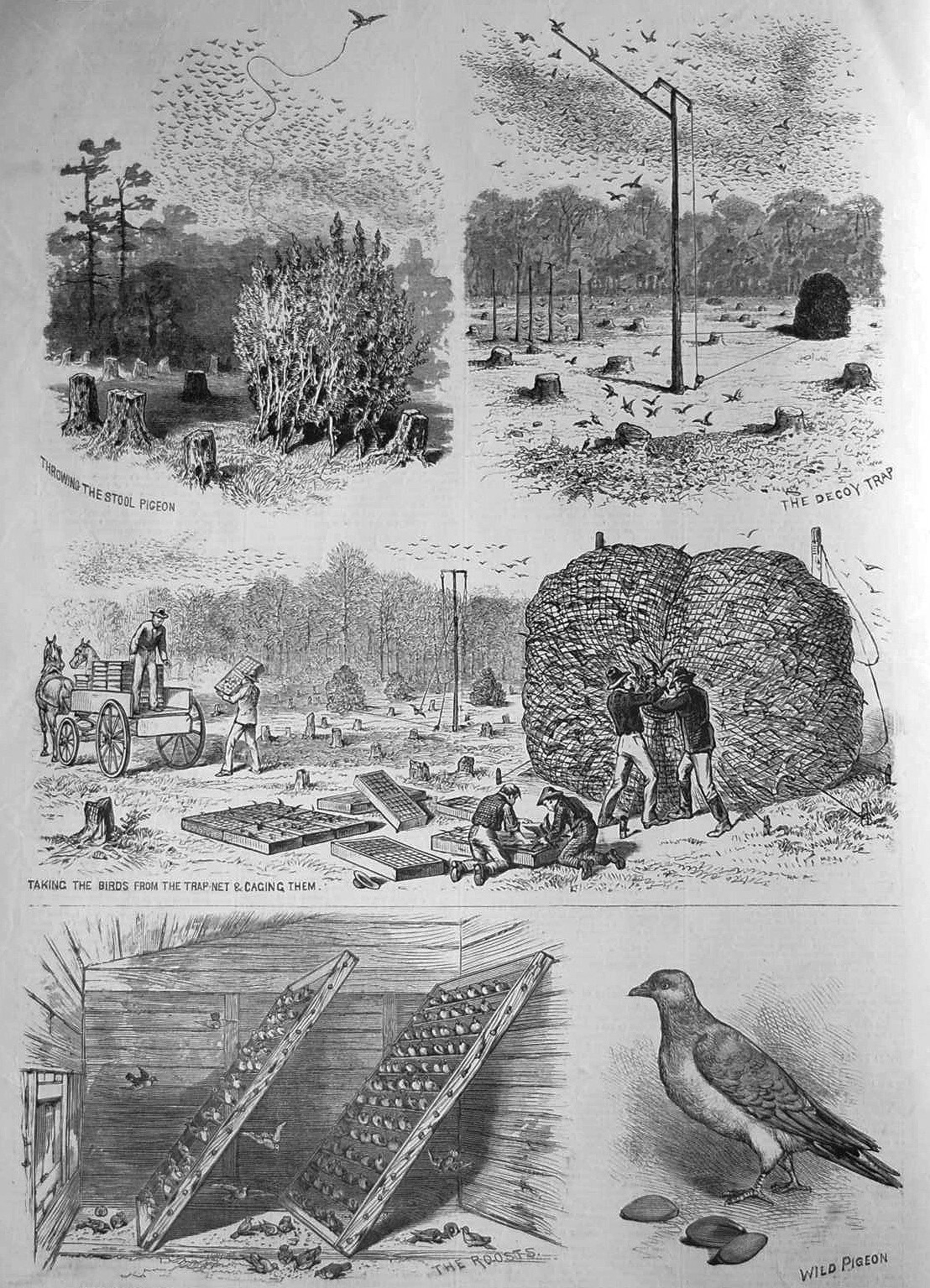 여행비둘기 고기는 매우 맛있다고 알려져, 총, 새그물, 막대기를 사용해 많은 사람들이 포획을 실시했으며, 비둘기 사냥은 미 서부에서의 금 채취, 곡식 투기 등으로 벼락부자가 된 졸부에게는 일종의 '스포츠'였다. 여행비둘기 포획을 전문으로 하는 사냥꾼에 의해 조직적이고 대규모에 걸친 대량 학살이 이루어졌으며, 심지어 3만 마리를 사냥 대회에서 이기려고 죽인 사냥꾼도 있었다. 미국의 졸부들과 사냥꾼들은 여행비둘기를 생명을 가진 동물로서 존중하지 않고 놀이를 위한 장난감으로 여겼다.