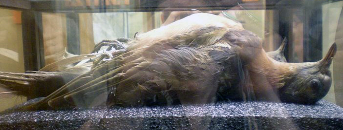 웃는올빼미는 뉴질랜드 고유종 올빼미로, 웃는 듯한 울음소리를 내며 몸길이 약 40cm이지만 외래종 유입과 서식지 파괴로 1914년 멸종된 것으로 추정된다. - 절멸한 새 - 슈아죌비둘기