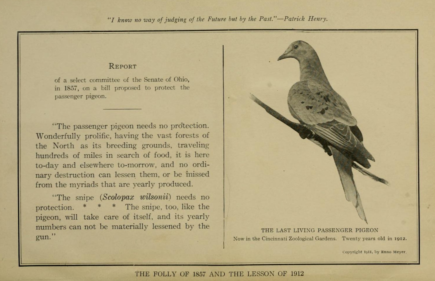 18세기 북아메리카 전역에는 50억 마리로 추정되는 여행비둘기가 서식했으며, 이는 세계에서 가장 많은 수였다. 그러나 19세기에 들어 흑인, 빈곤층, 노예를 위한 식용, 사료, 깃털 채취 목적으로 남획이 이루어져 개체수가 급감했다. 당시 자본가들은 여행비둘기를 돈벌이 수단으로 여겨 여행비둘기 고기를 기차로 수송하는 운송업을 하기도 했다. 막대한 개체수 때문에 멸종하지 않을 것이라는 무지로 인해 여행비둘기 보호는 진지하게 검토되지 않았다.