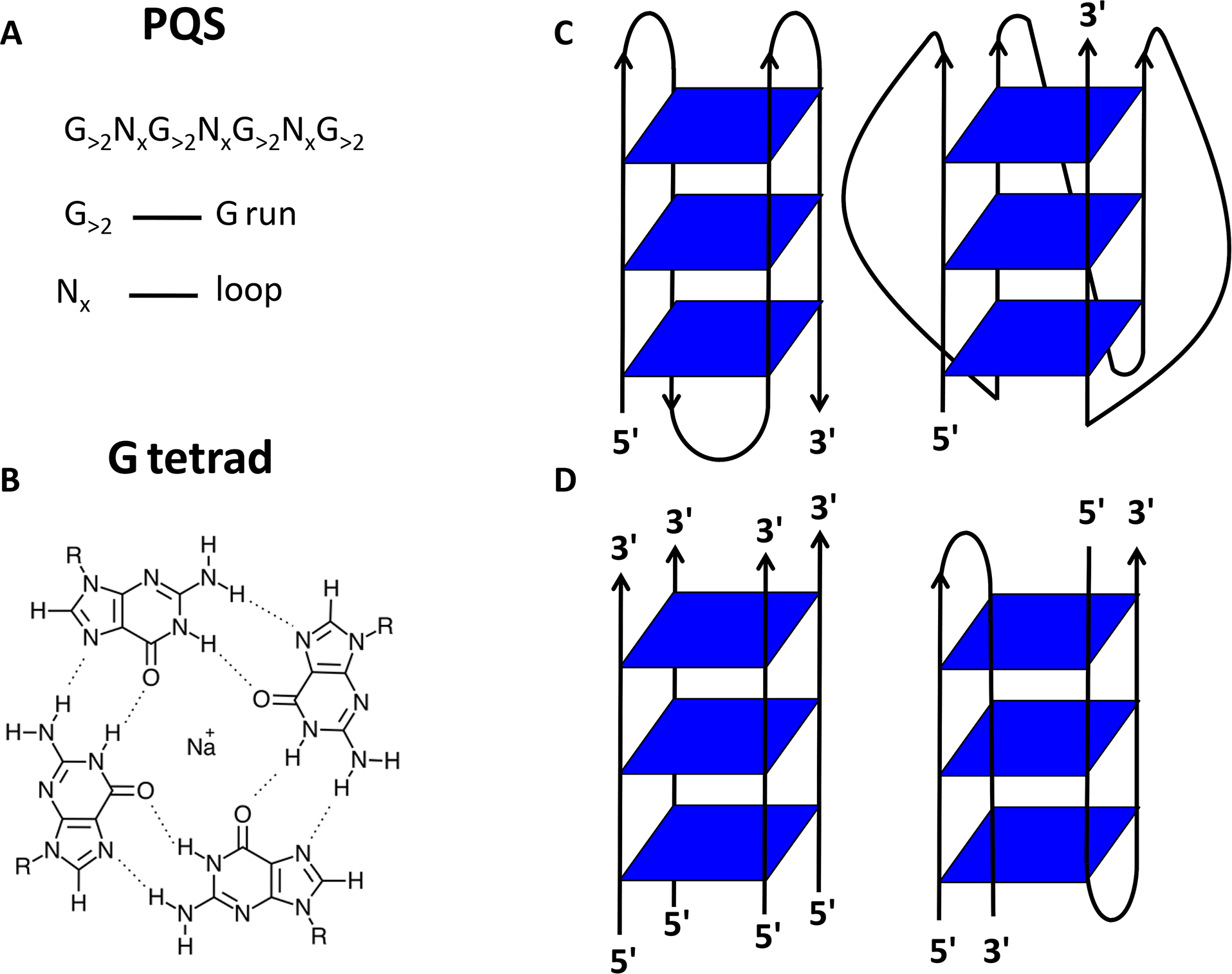 G4 DNA라고도 하는 G-quadruplex는 구아닌이 풍부한 핵산에서 발견되는 2차 구조이다.[13] 이들 구조는 일반적으로 텔로미어(염색체의 말단)에 위치한다. G-quadruplex는 구조의 구성 요소인 루프 구성에 따라 평행 또는 역평행일 수 있다. 모든 DNA 가닥이 동일한 방향으로 진행되는 경우 평행 사중선이라고 하며, 인접한 평행 가닥을 연결하는 가닥 역전/프로펠러라고 한다. 하나 이상의 DNA 가닥이 반대 방향으로 진행되는 경우, 역평행 사중체(anti-parallel quadruplex)라고 하며 측면/가장자리 형태, 인접한 역평행 가닥을 연결하는 대각선 또는 두 개의 대각선으로 연결되는 대각선의 형태일 수 있다.[14] 이러한 G-quadruplex의 구조는 양이온에 의해 결정될 수 있다.