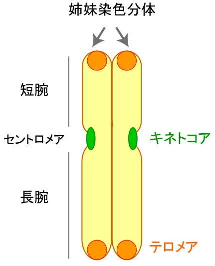응축된 염색체는 동원체에서 연결된 한 쌍의 자매 염색분체로 구성되며, 짧은 팔을 p 팔, 긴 팔을 q 팔이라고 한다. 분열기의 염색체는 한 쌍의 자매 염색분체로 구성되며, 염색분체들이 서로 강하게 접합하고 있는 영역을 동원체라고 한다. 분열기에는 동원체 위에 형성되는 키네토코어에 미세소관이 결합하여 염색분체를 양극으로 끌어당긴다. 염색체의 말단부는 텔로미어라고 불리는 특유의 구조를 하고 있다.