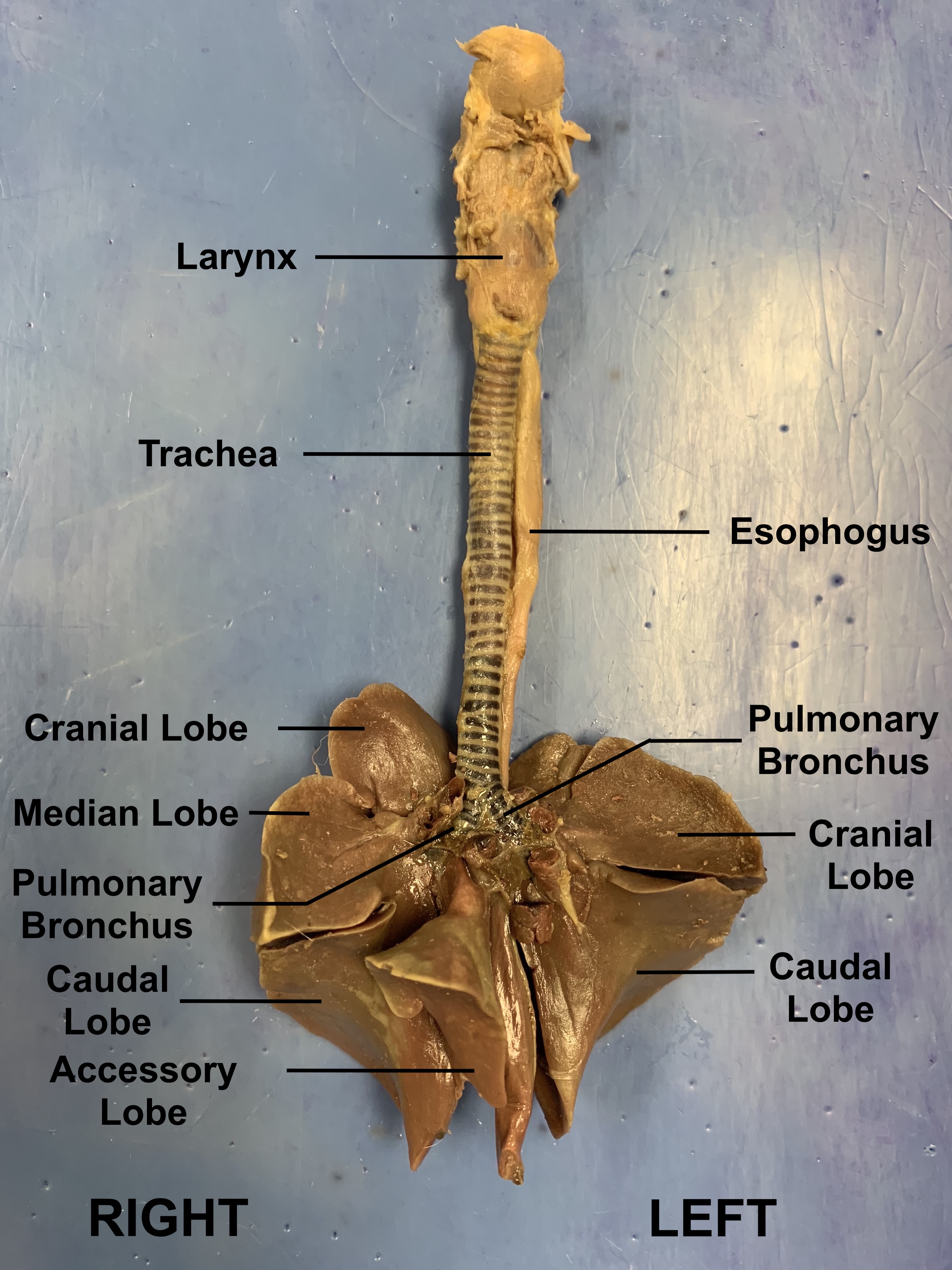 왼쪽 폐에서 앞엽간열은 '''앞엽'''(cranial lobe|크래니얼 로브영어, lobus cranialis|로부스 크라니알리스la)을 '''앞엽 앞부분'''과 '''앞엽 뒷부분'''으로 나누고, 뒤엽간열은 앞엽 뒷부분의 뒤쪽을 구분하며, 최대의 '''뒤엽'''(caudal lobe|코달 로브영어, lobus caudalis|로부스 카우달리스la)을 만든다[14][15]。