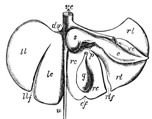 c:'''꼬리엽''', dv:정맥관, g:담낭, lc:'''내측 좌엽''', ll:'''외측 좌엽''', p:문맥개구부, rc:'''내측 우엽''', rl:'''우측 우엽''', s:'''Spigel엽''', u:제정맥, vc:하대정맥, cf; llf; rlf:'''엽간 절흔'''