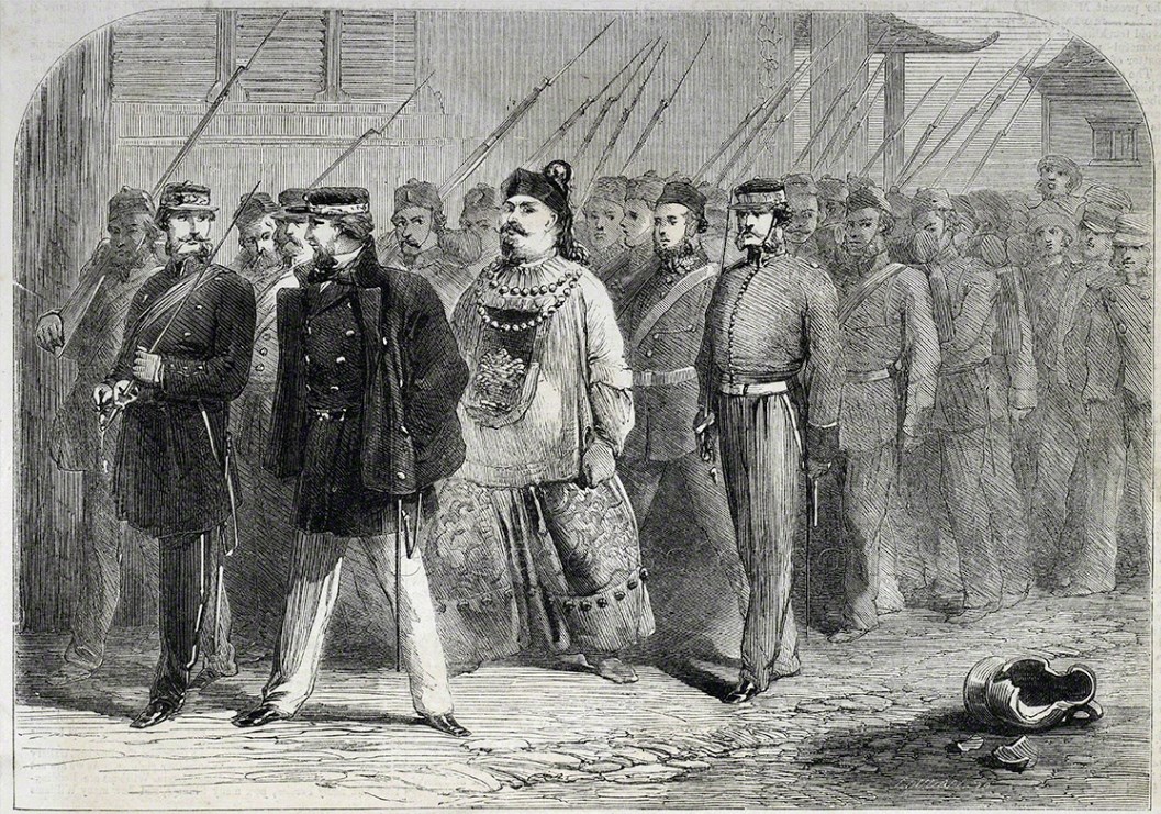 영국 HMS ''인플렉서블''호에 억류되어 있던 엽명침의 스케치는 그를 흉측한 괴물로 묘사하기 위해 제작되었다. 이 스케치는 애로우호 전쟁(제2차 아편 전쟁)을 정당화하는 영국 선전물로 널리 퍼졌다.[9]
