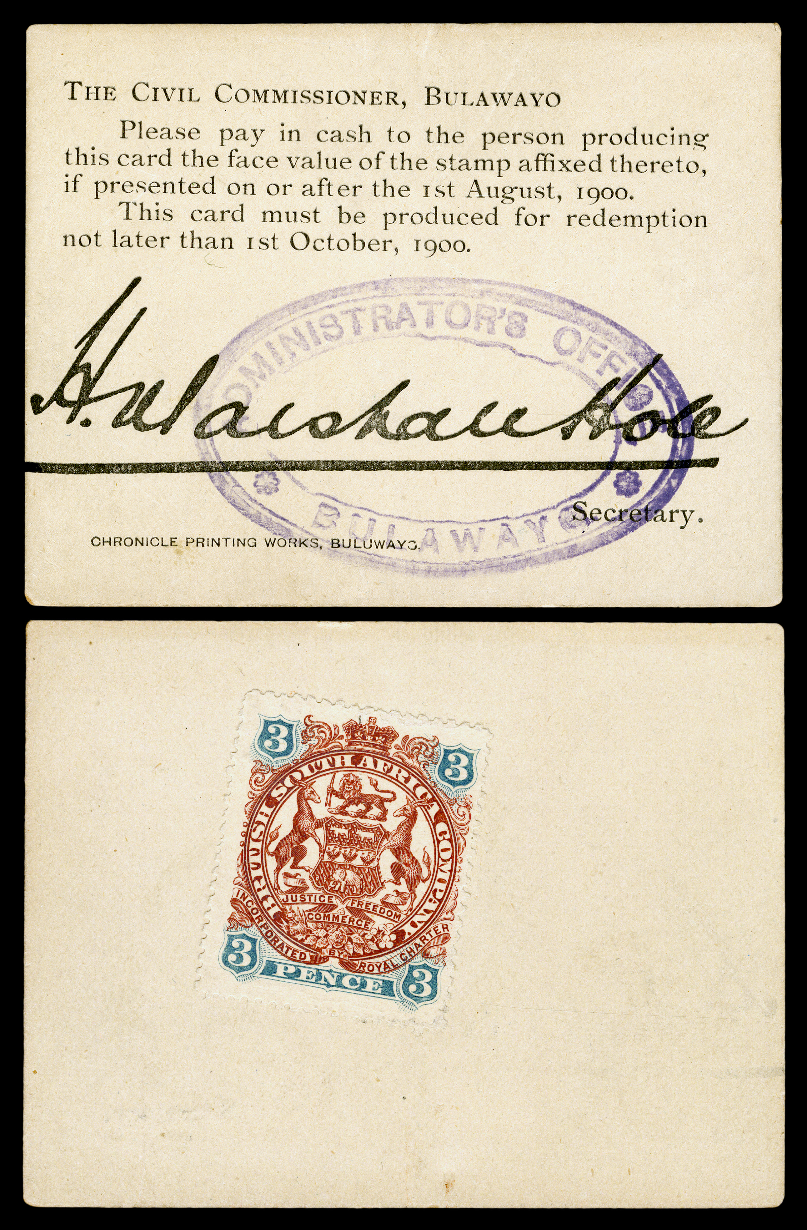 1901년 이전 잠베지 강 북쪽의 행정은 미흡했습니다. 북동 로디지아에서는 아버콘과 파이프가 요새화된 전초기지였고, 북동 로디지아 행정관은 제임슨 요새가 생길 때까지 영국 중앙 아프리카 보호령의 블랜타이어에 거주했습니다. 바로트실란드-북서 로디지아에는 1901년까지 사무국이 없었습니다.[53]