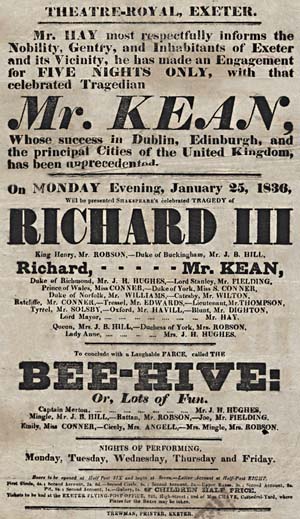 1836년 엑스터 왕립 극장의 공연 포스터, 찰스 킨이 ''리처드 3세'' 공연에 출연했다.
