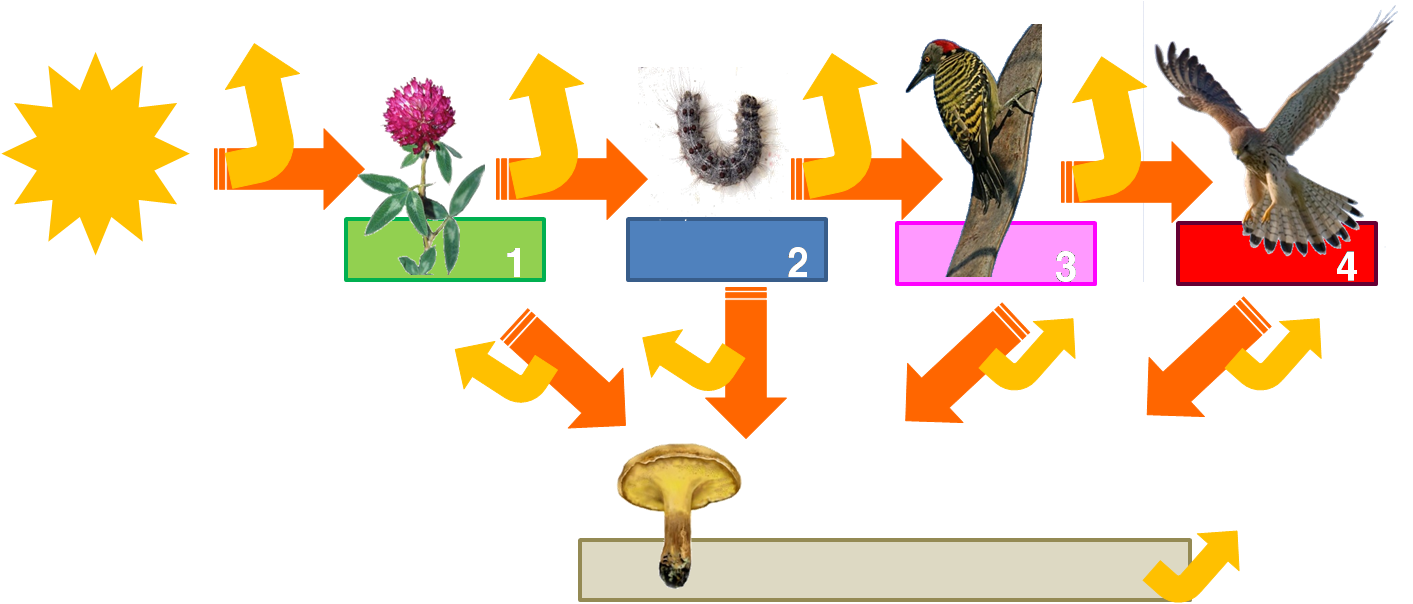 태양 에너지를 근원으로 하는 생물의 에너지는 각 영양 단계를 거치면서 상위 단계의 생물에게 전달된다. 그러나, 각 단계의 생물은 생명 활동을 통해 상당수의 에너지를 로 방출한다. 이러한 형태의 에너지는 다음 단계의 생물에게 전달되지 않기 때문에, 생물들이 생장하여 축적한 에너지만이 다음 단계의 생물에게 전달된다. 이러한 이유로 한 영양 단계에 있는 약간의 에너지만 다음의 높은 단계의 유기체에게 전달된다.[32]